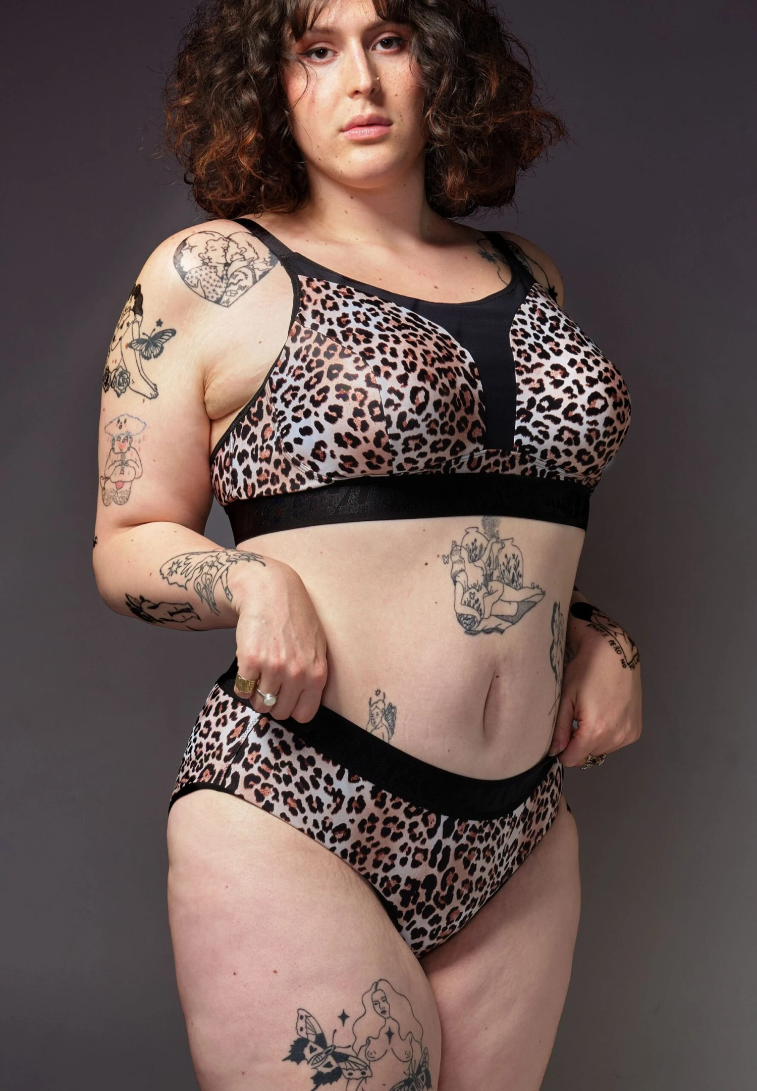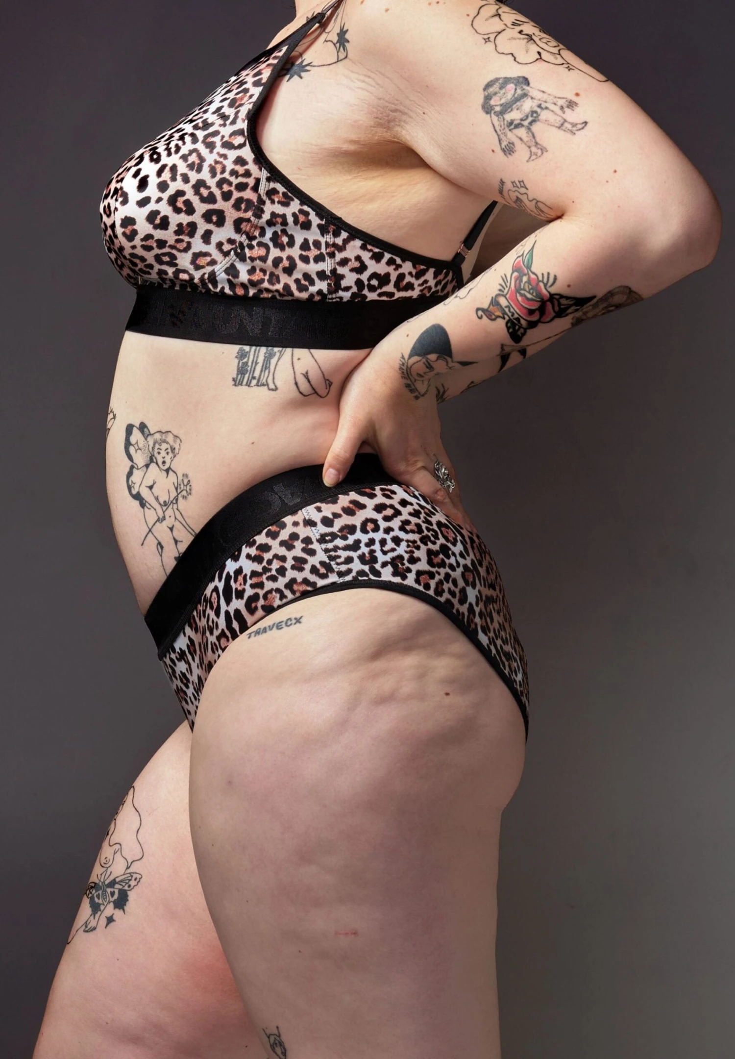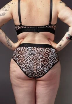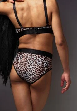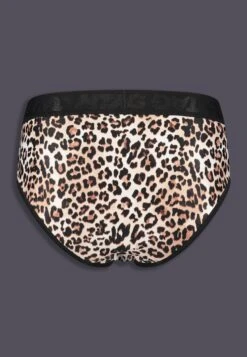The Signature Tucking Bikini Brief is a pair of gender-affirming swimming panties that boast a stylish leopard print. The slip flattens the penis for a smooth and sleek look while you’re swimming. The advanced breathable material makes sure the genitals stay securely in place. This will allow you to move freely in the water with a secure and feminine feeling. The Bikini Brief has a low waist and fits like regular panty briefs for maximum coverage and comfort. A thick elastic waistband shapes the waistline. These bottoms can be worn with both a semi-tuck and a full tuck. Please note that this is not a full bikini – these are just bottoms.
