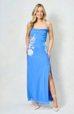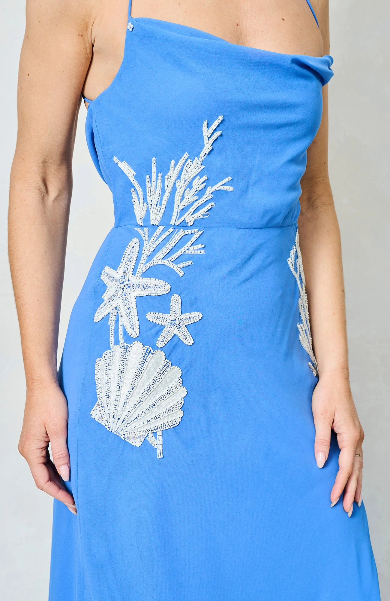 Whether you’re headed on the holiday of a lifetime or have a special summer occasion that requires a show-stopping beachside look, this dress is the one for you. Deep blue in shade, The Blaire features intricate embellishments of captivating coral reefs, dazzling shells and starfish. With a dramatic thigh split and a daring open tie back, you’re guaranteed to create a final look that’s destined to have you on every best-dressed list this season.
