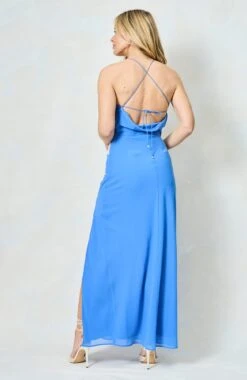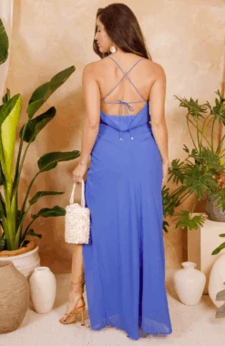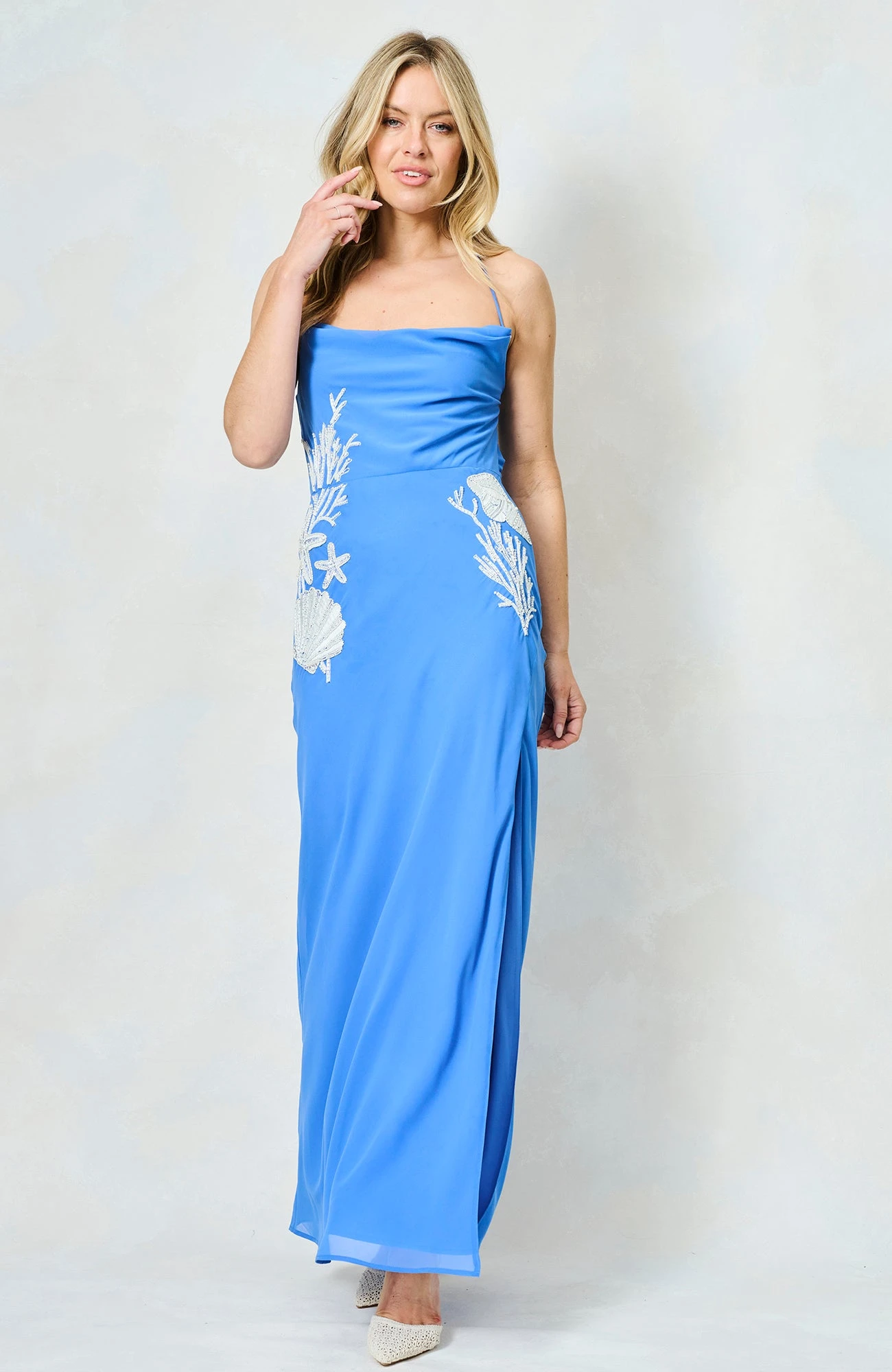 The Blaire Embellished Cowl Neck Cami Maxi Dress with Tie Back and Thigh Split
