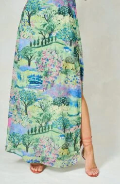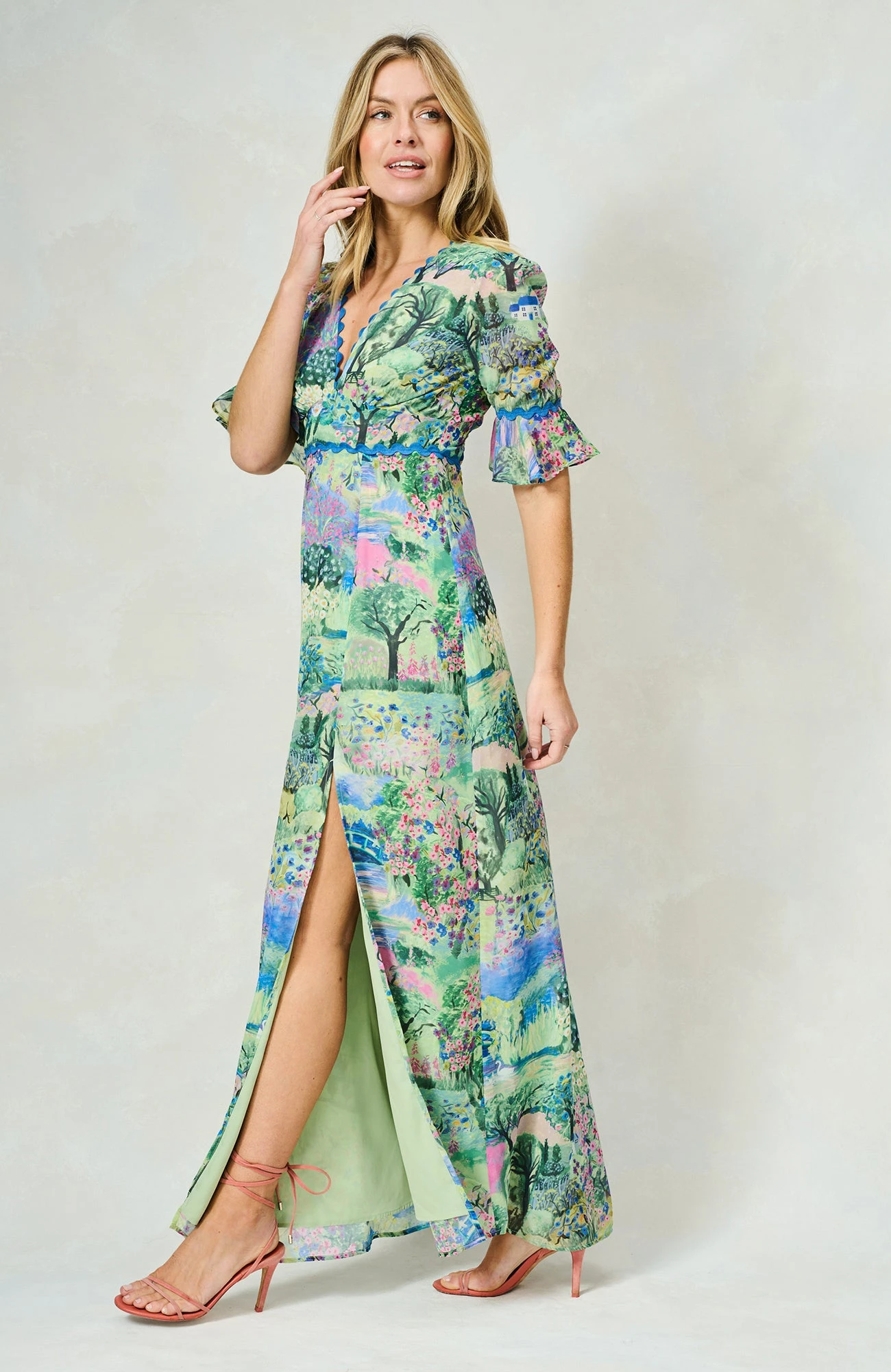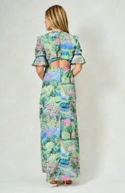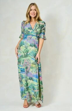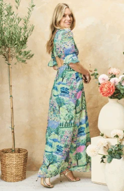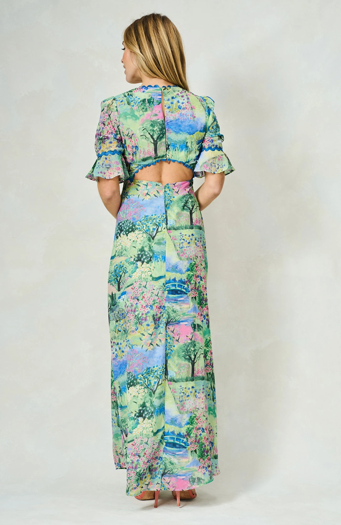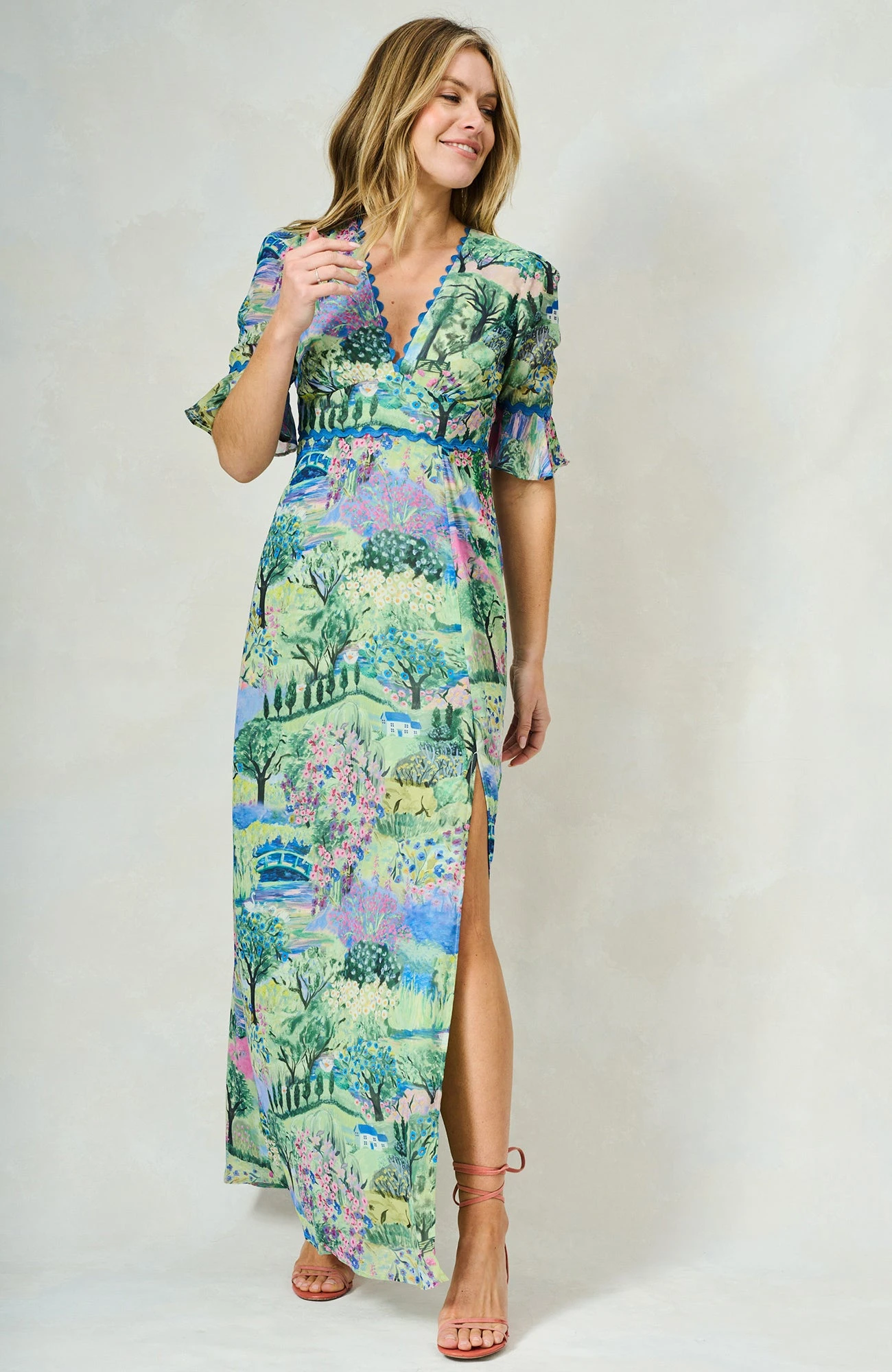 This charming Hope & Ivy design features a hand-stylised landscape print inspired by Monet’s gardens in Giverny. With a plunge v-neckline and maxi-length skirt, this figure-skimming dress is designed to flatter and flow with the body. Delicate trims detail the fluted sleeves, with a generous side split that allows for graceful movement. A keyhole back is the final elegant touch.