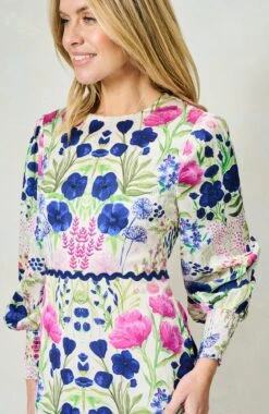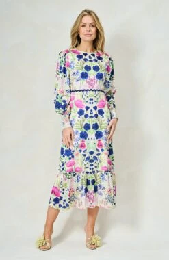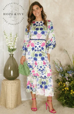 The Caroline sees Hope & Ivy’s signature florals reinterpreted in a contemporary mirrored pattern on a white satin base. Full blouson sleeves and a maxi skirt with a slight frilled hem create a chic silhouette, whilst the keyhole back detail with bow tie add an extra touch. Finished with a trim at the waist and shirred back panel for ease of wear.