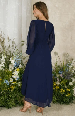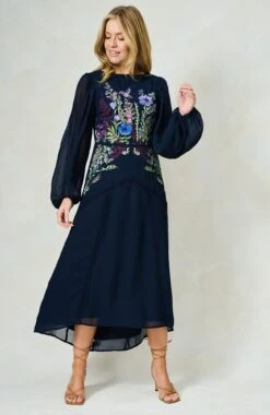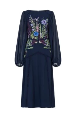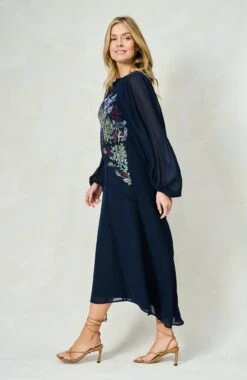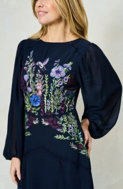 Beautifully decorated with a sparkling hummingbird, The Cassandra dress is an artful piece to wear at your next special occasion. It’s cut from navy georgette and intricately embellished with sequinned florals that flow from the high neck to the banded skirt.