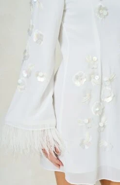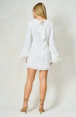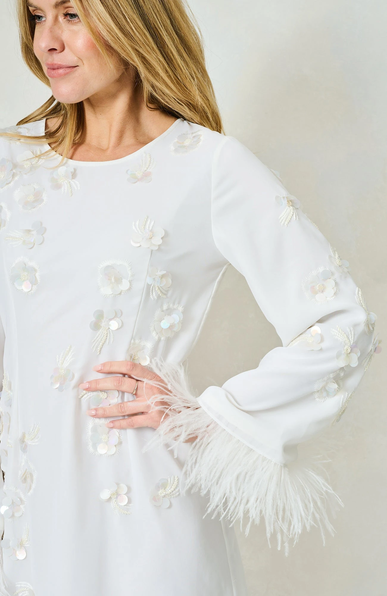 The flirty mini length and fabulous feather-trimmed cuffs of The Clementine make it a fun and feminine occasion piece! Perfect for engagement drinks, a rehearsal dinner, or an opportunity to dance the night away at an evening reception, this ivory, georgette piece is embellished with pearlescent sequins, white beads and intricate embroidery. Draw attention to the bow back by wearing your hair in a chic up-do.Â