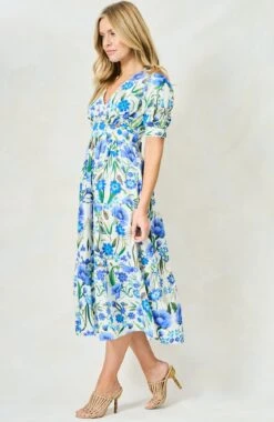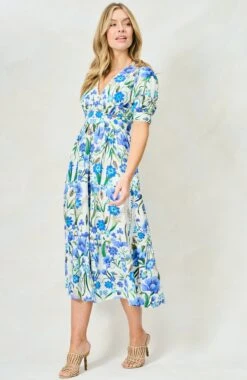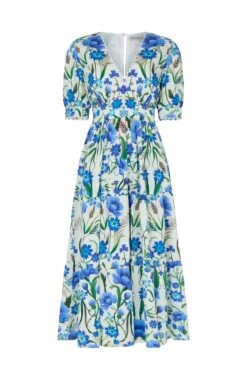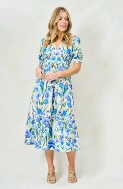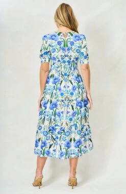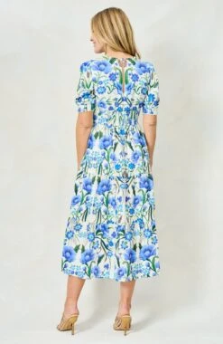 A feminine full-skirted tea dress is perfect for picnics, garden parties and all sorts of seasonal soirées. With a mirrored blue floral print, The 100% cotton Erica is cut with a flattering V-neck and complete with puff sleeves and a banded skirt. We love the little details, including the rickrack trim and flexible smocked back.