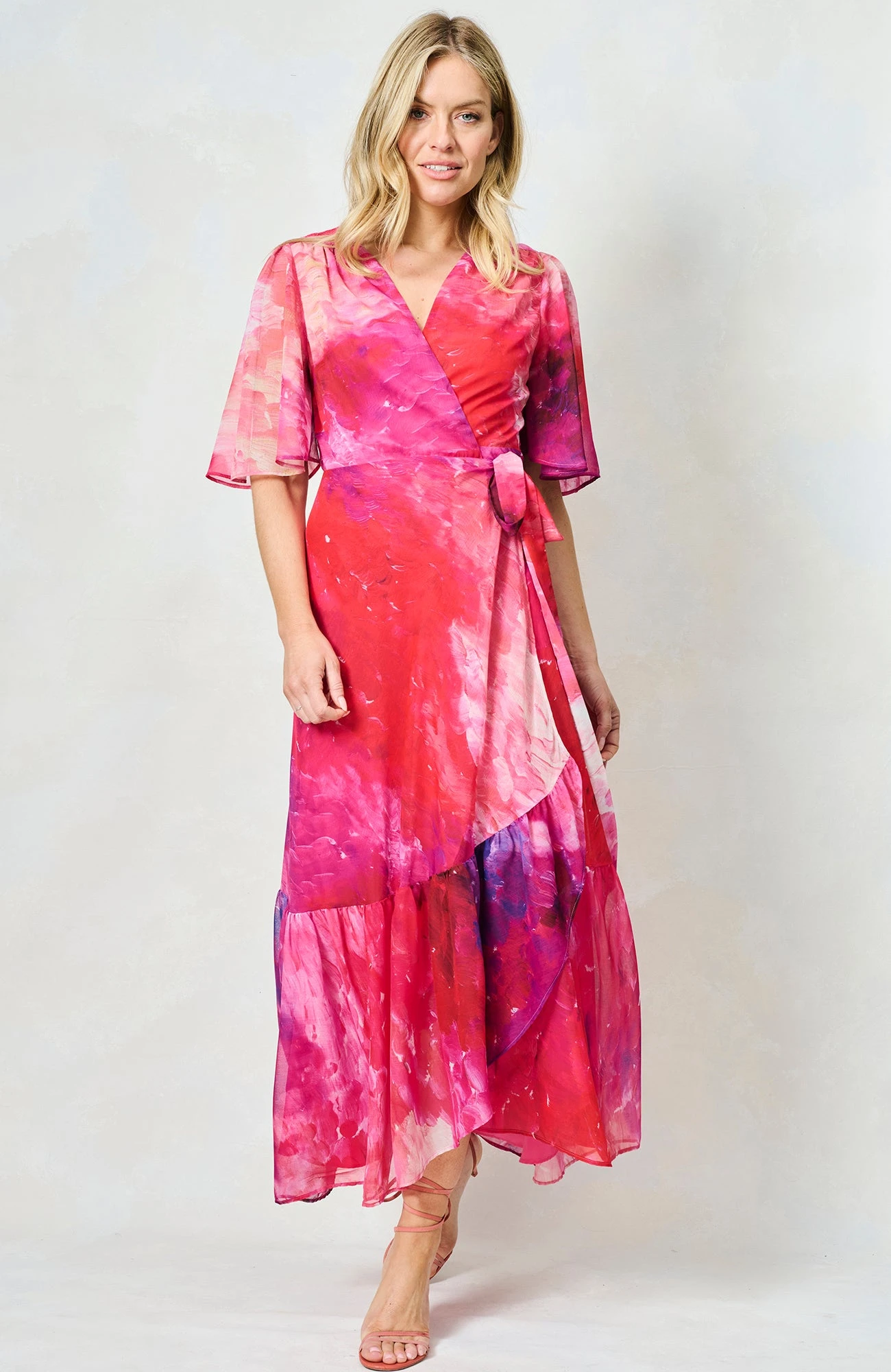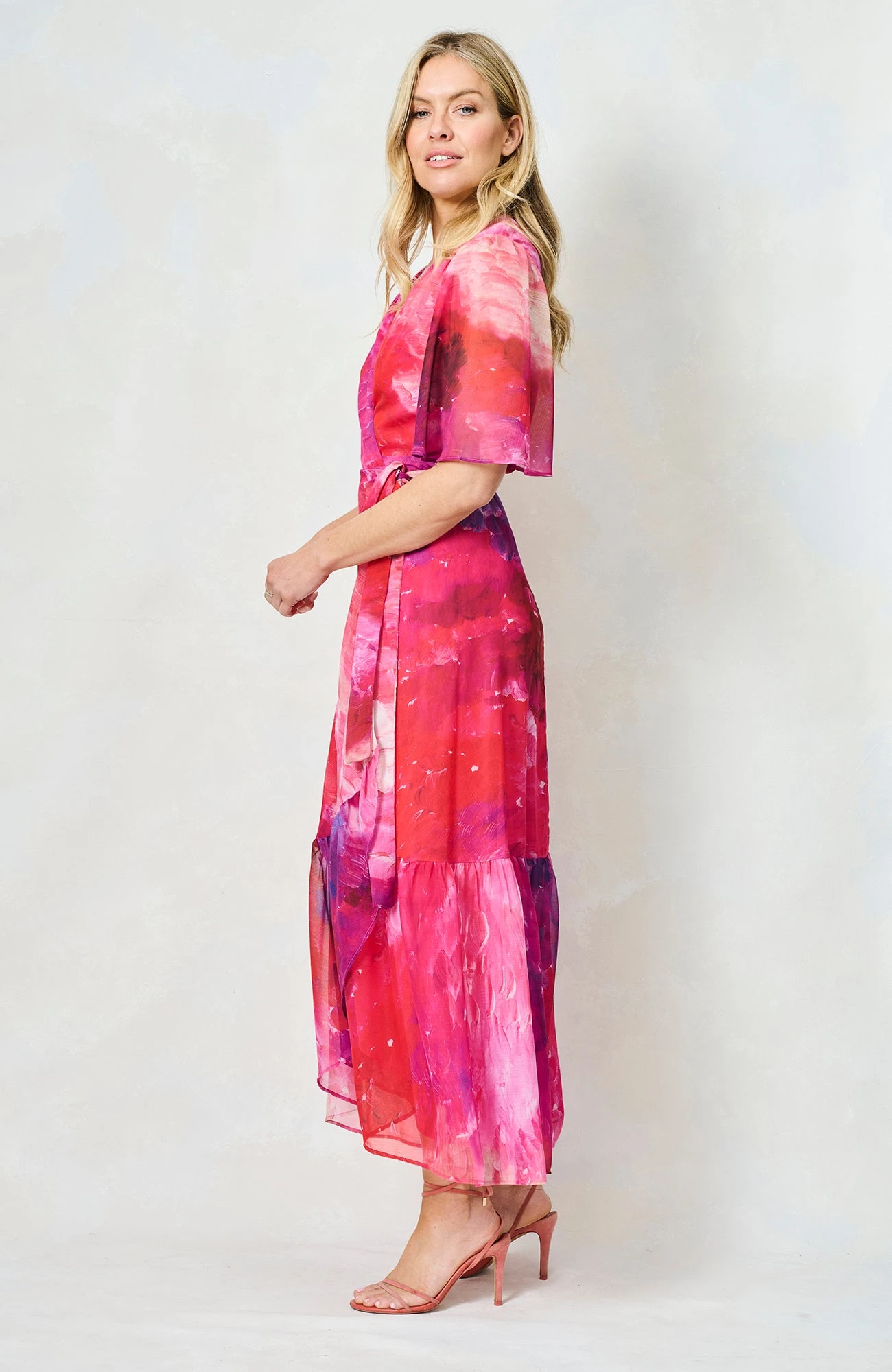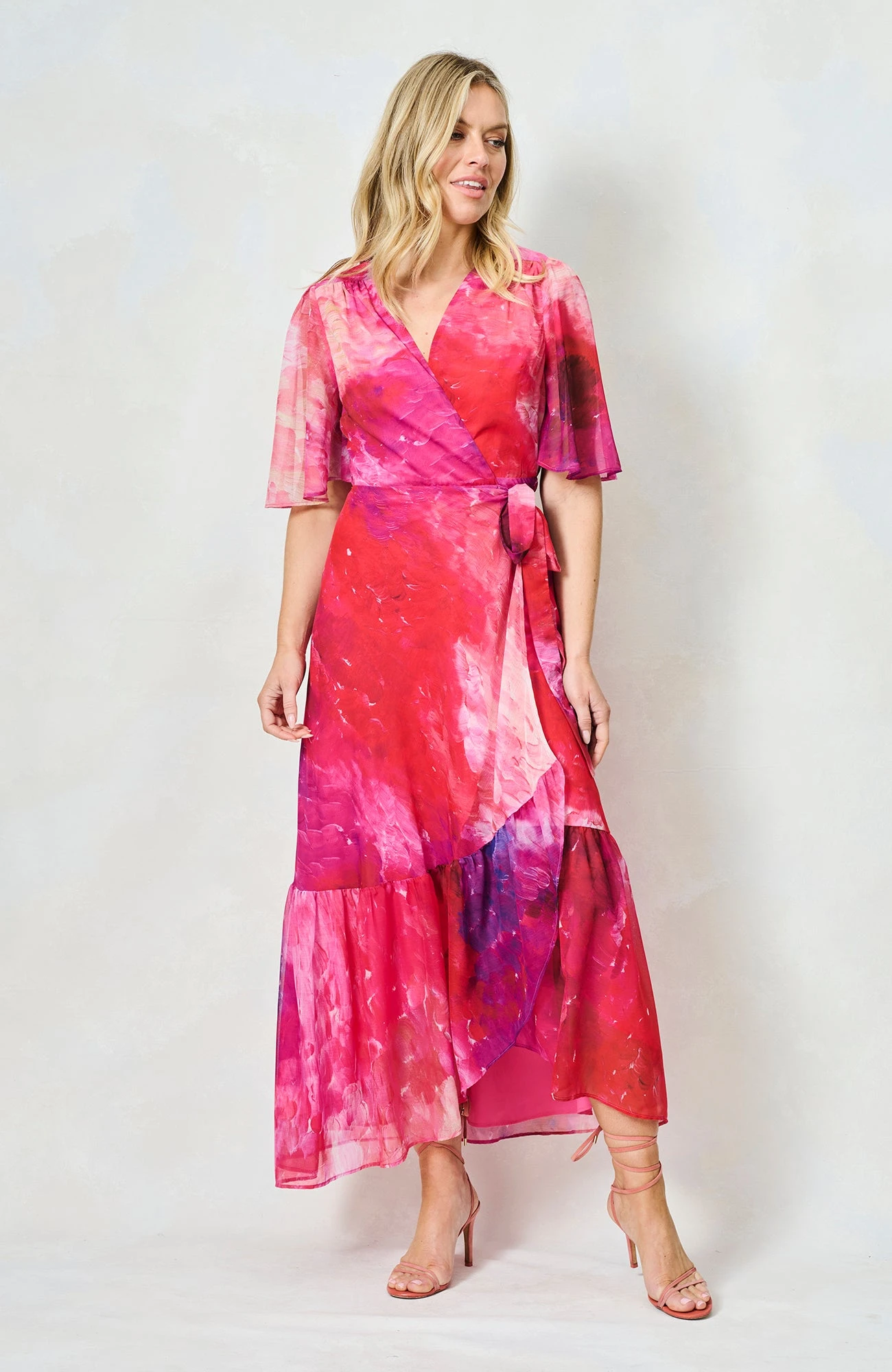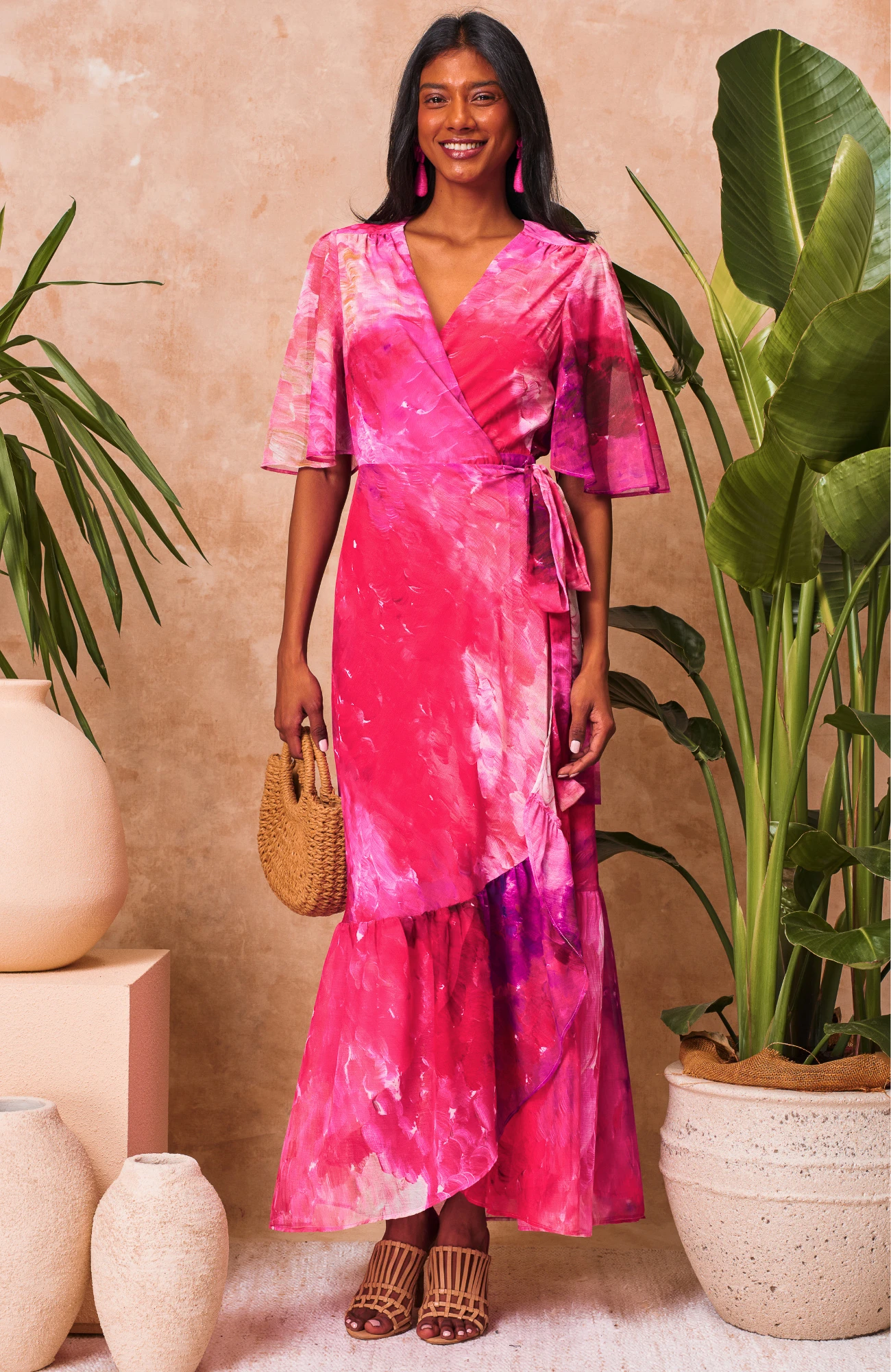 Experience signature Hope & Ivy print handwriting and a classic silhouette in this design. Cut to a sweeping maxi length from soft chiffon, The Hermione wrap dress exudes a romantic, floaty feel that’s perfect for special occasions. The deep pink base is decorated with a dramatic, purple print that conjures up visions of spell-binding summer sunsets. The feminine flutter sleeves and adjustable tie-fastening wrap front ensure a streamlined silhouette that’s sure to turn heads.