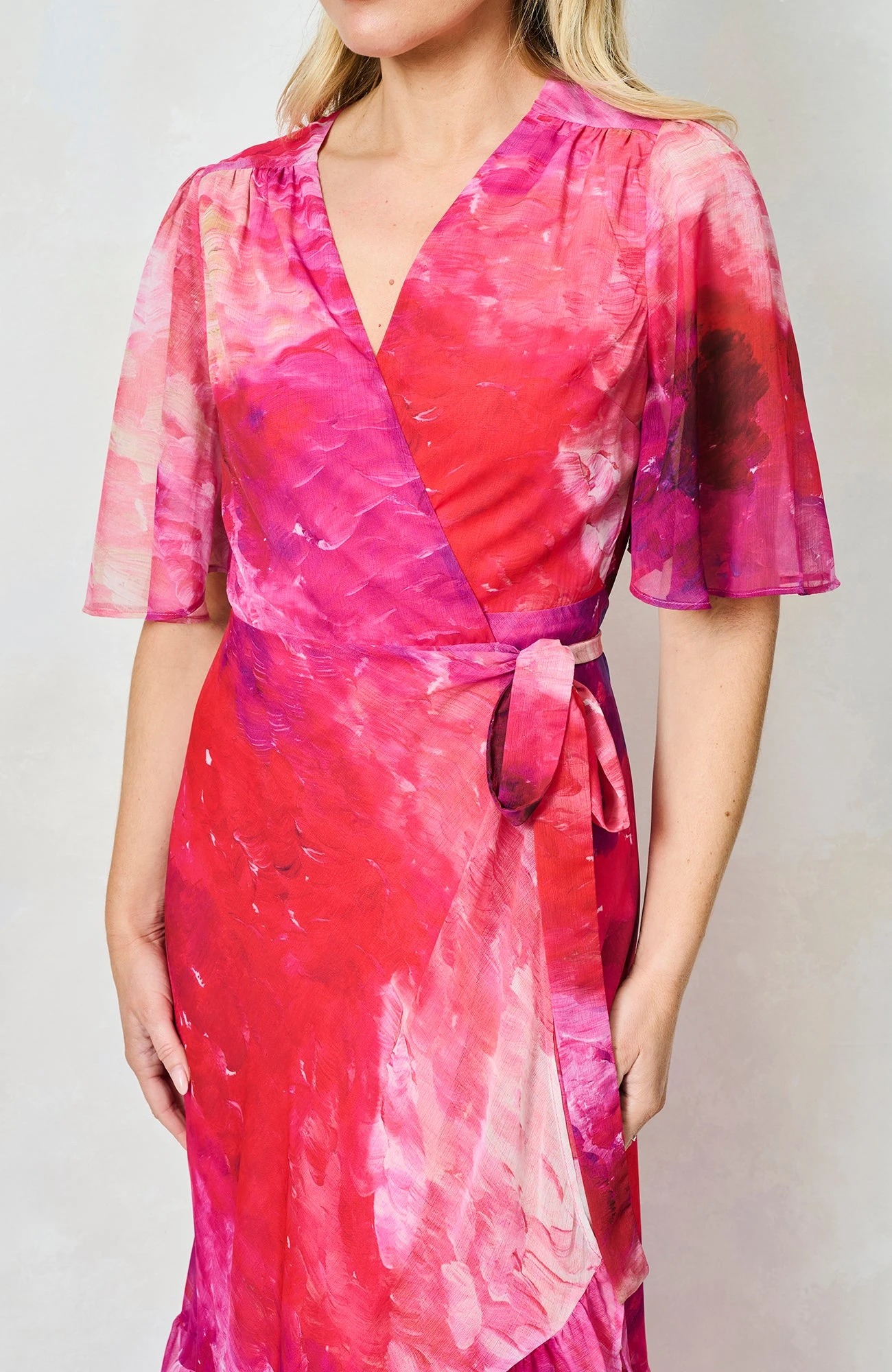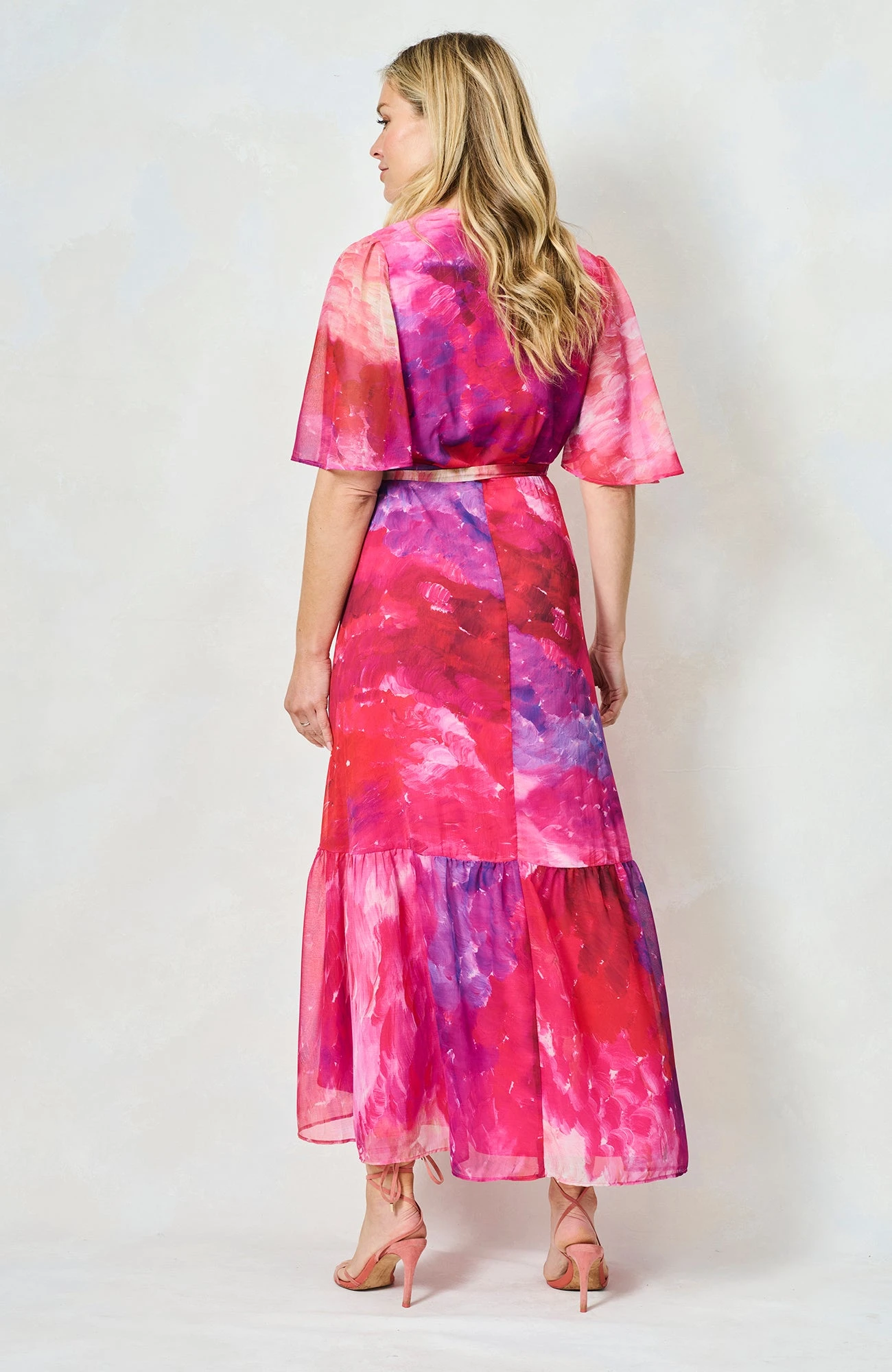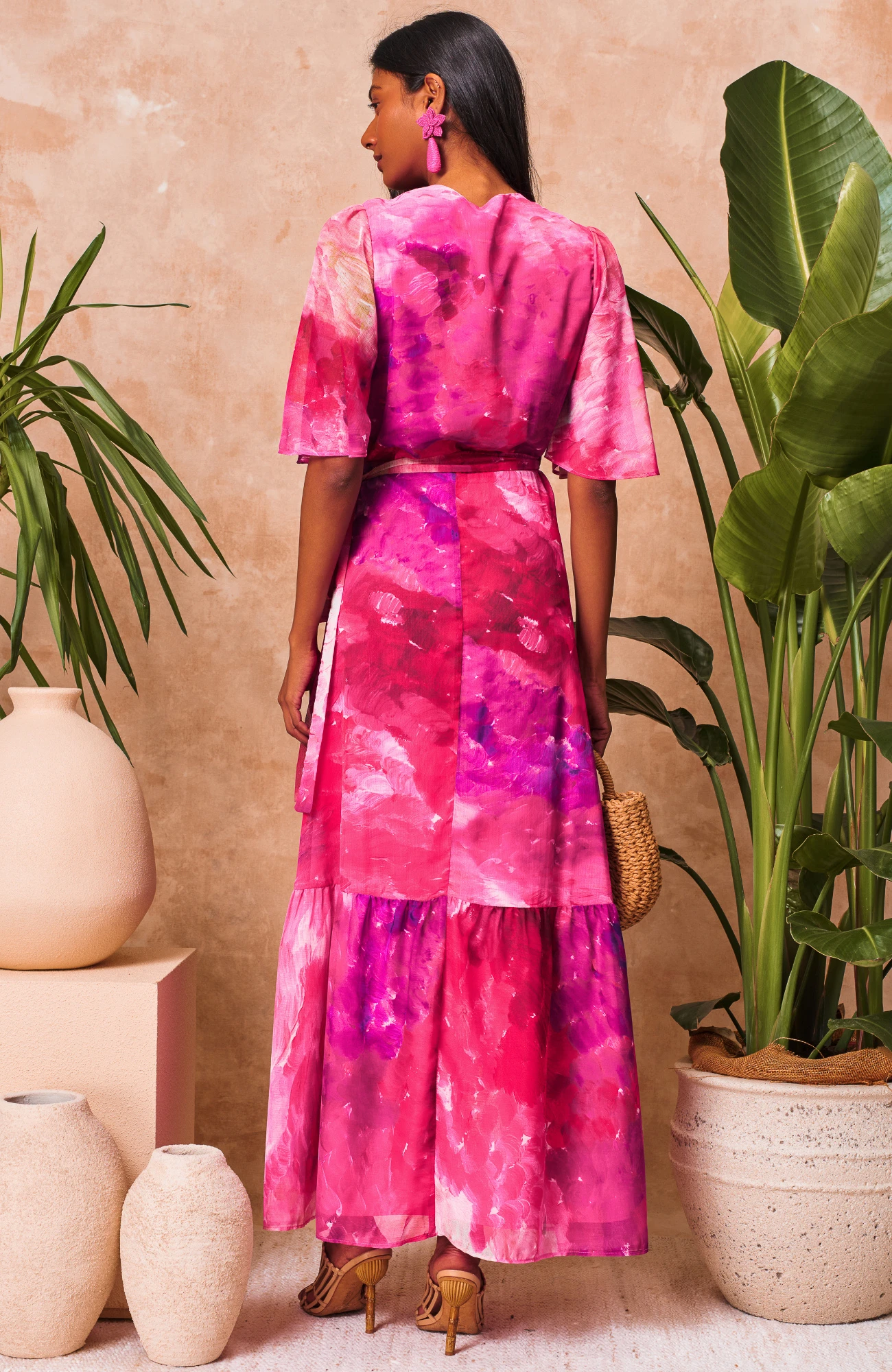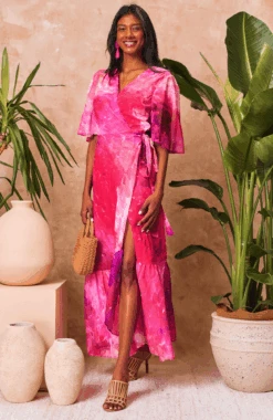 Experience signature Hope & Ivy print handwriting and a classic silhouette in this design. Cut to a sweeping maxi length from soft chiffon, The Hermione wrap dress exudes a romantic, floaty feel that’s perfect for special occasions. The deep pink base is decorated with a dramatic, purple print that conjures up visions of spell-binding summer sunsets. The feminine flutter sleeves and adjustable tie-fastening wrap front ensure a streamlined silhouette that’s sure to turn heads.