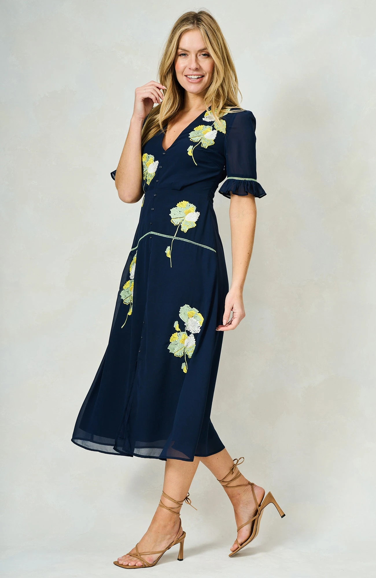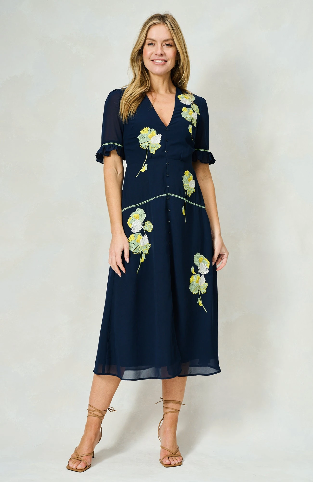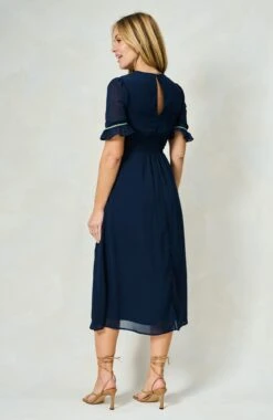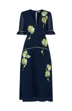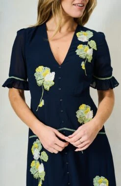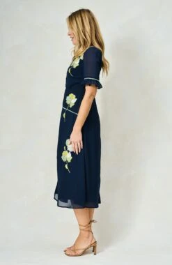 This delightful dress is signature Hope & Ivy design at its very best. Embroidered florals finely decorate the bust, waist and skirt of the navy base for elevated elegance, further lifted by covered, decorative button detailing down the front. With gorgeous, semi-sheer frill sleeves and a dreamy skirt that ends at mid-calf length, this style is set to be a must-have staple for every spring occasion.