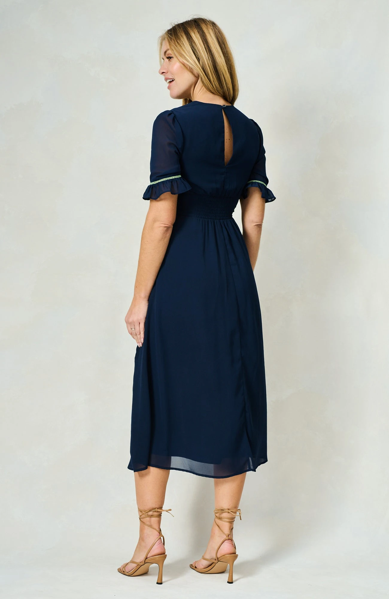 The Ingrid Embroidered Frill Sleeve Button Front Midi Dress with Ladder Trim