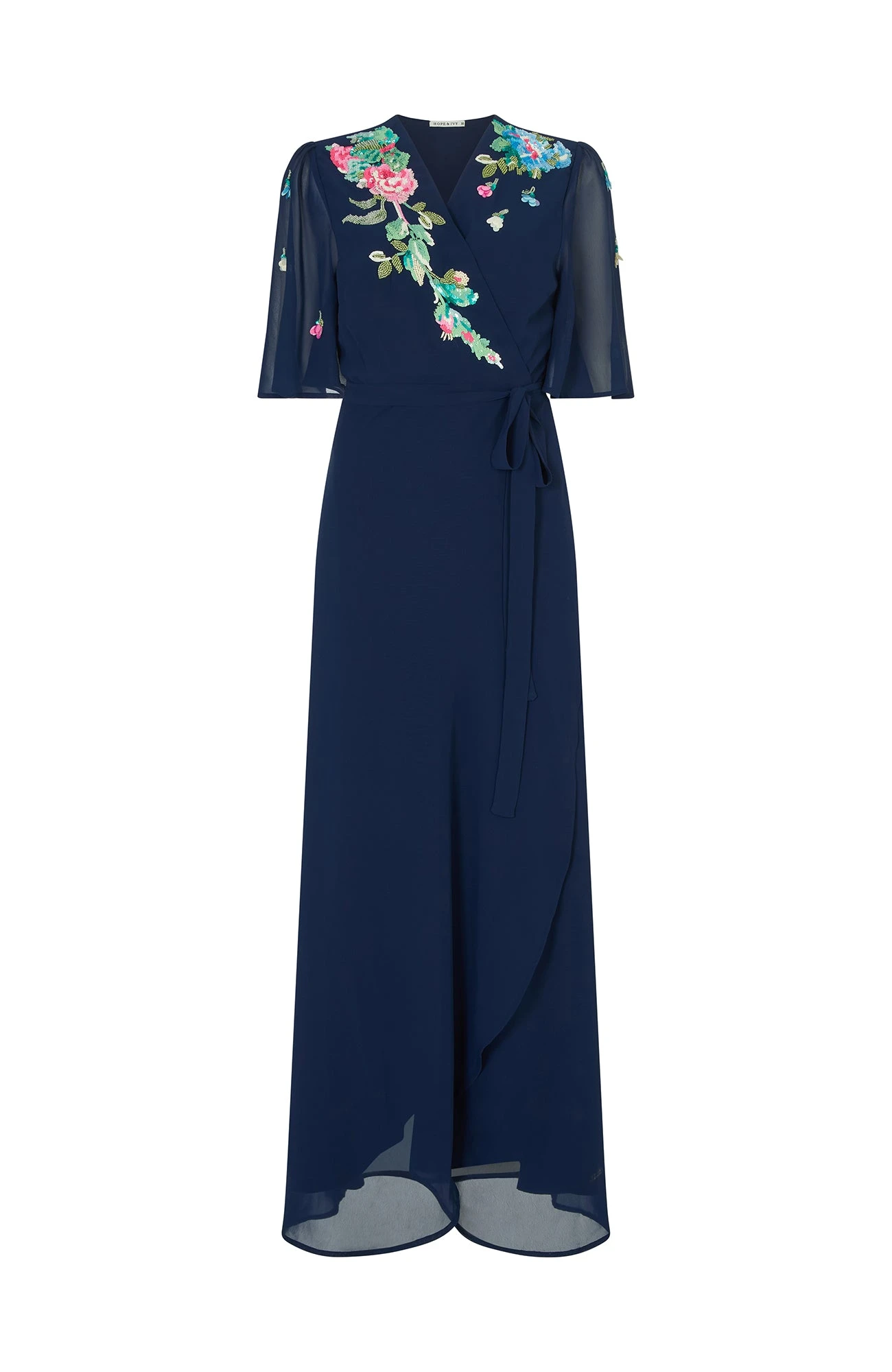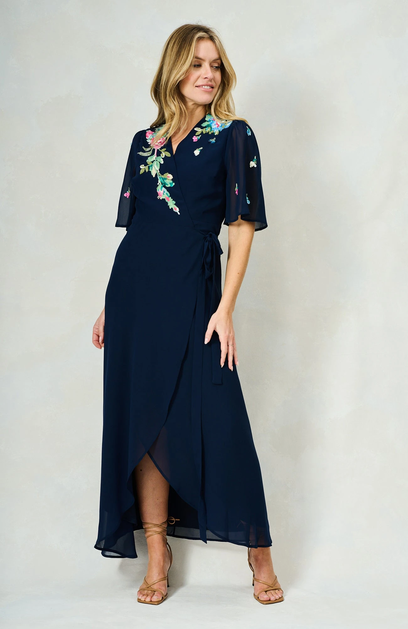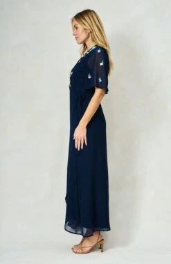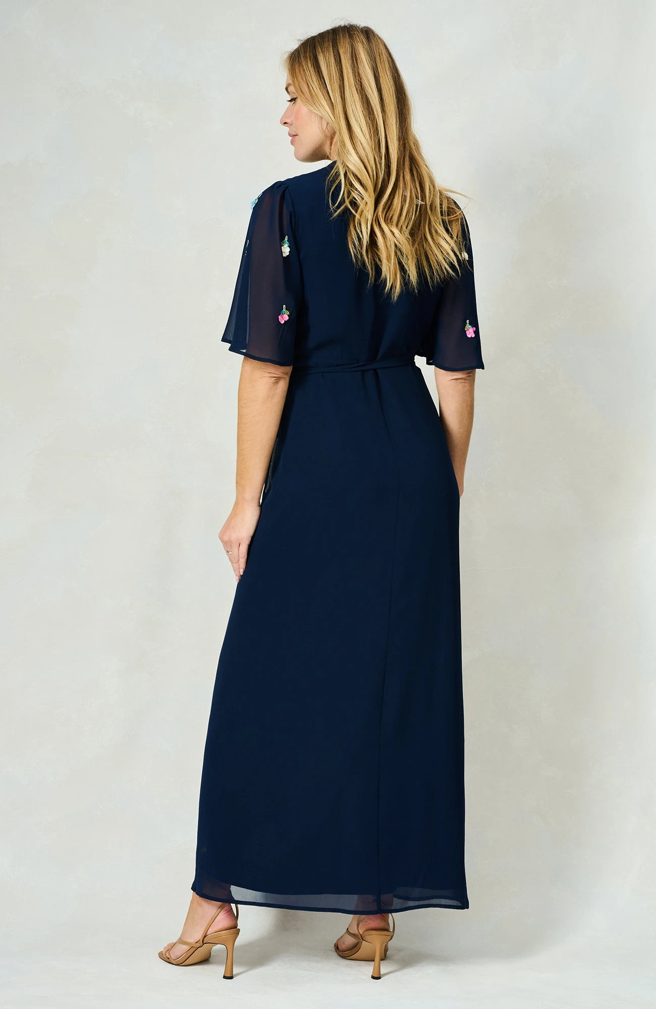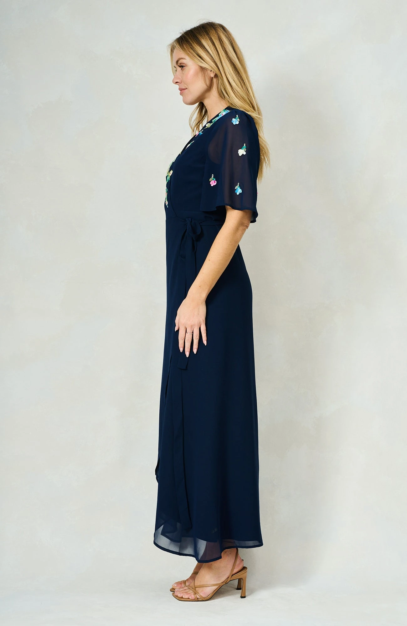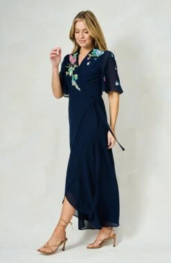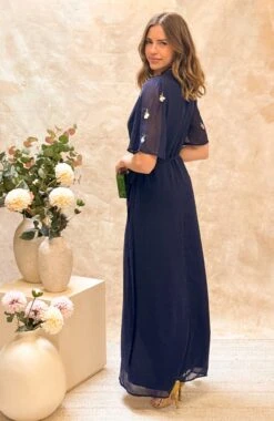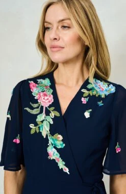 Fall head over heels in love with Hope & Ivy embellishment at its very best in this signature wrap style from our new spring collection. Sparkling sequinned floral embellishments are strewn across the navy base, making this a gorgeous stand-out piece. With flutter sleeves, a plunging v-neckline, and tie waist details, this stunning silhouette is bound to turn heads this season.