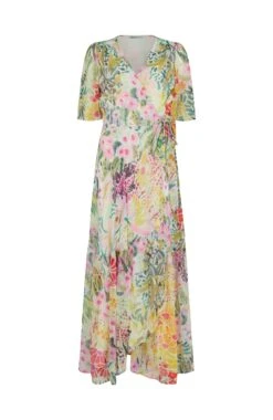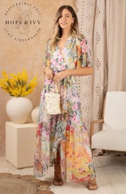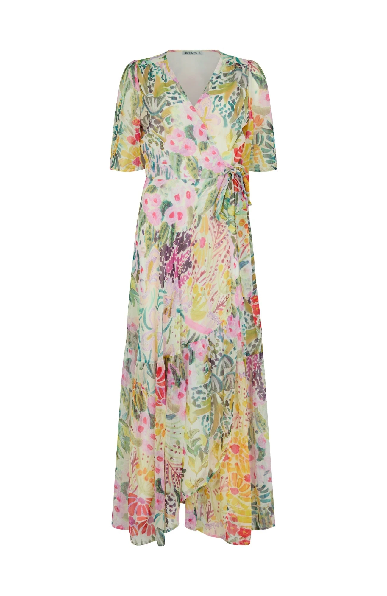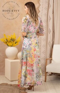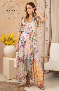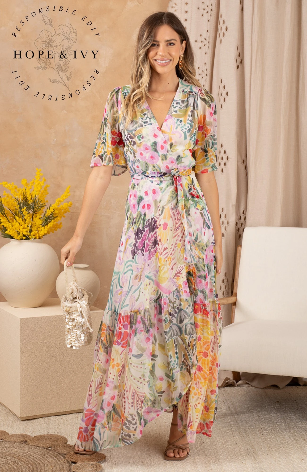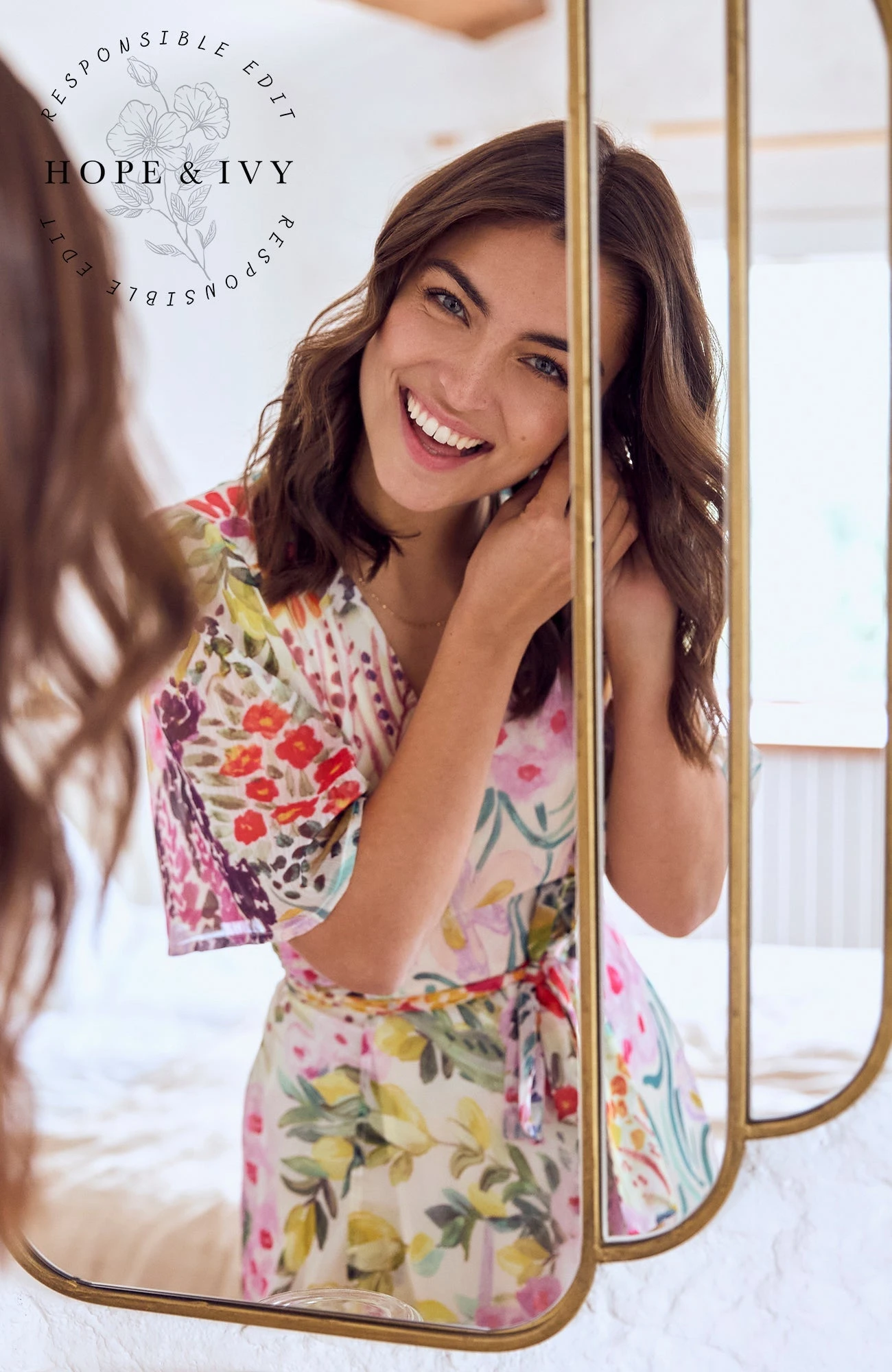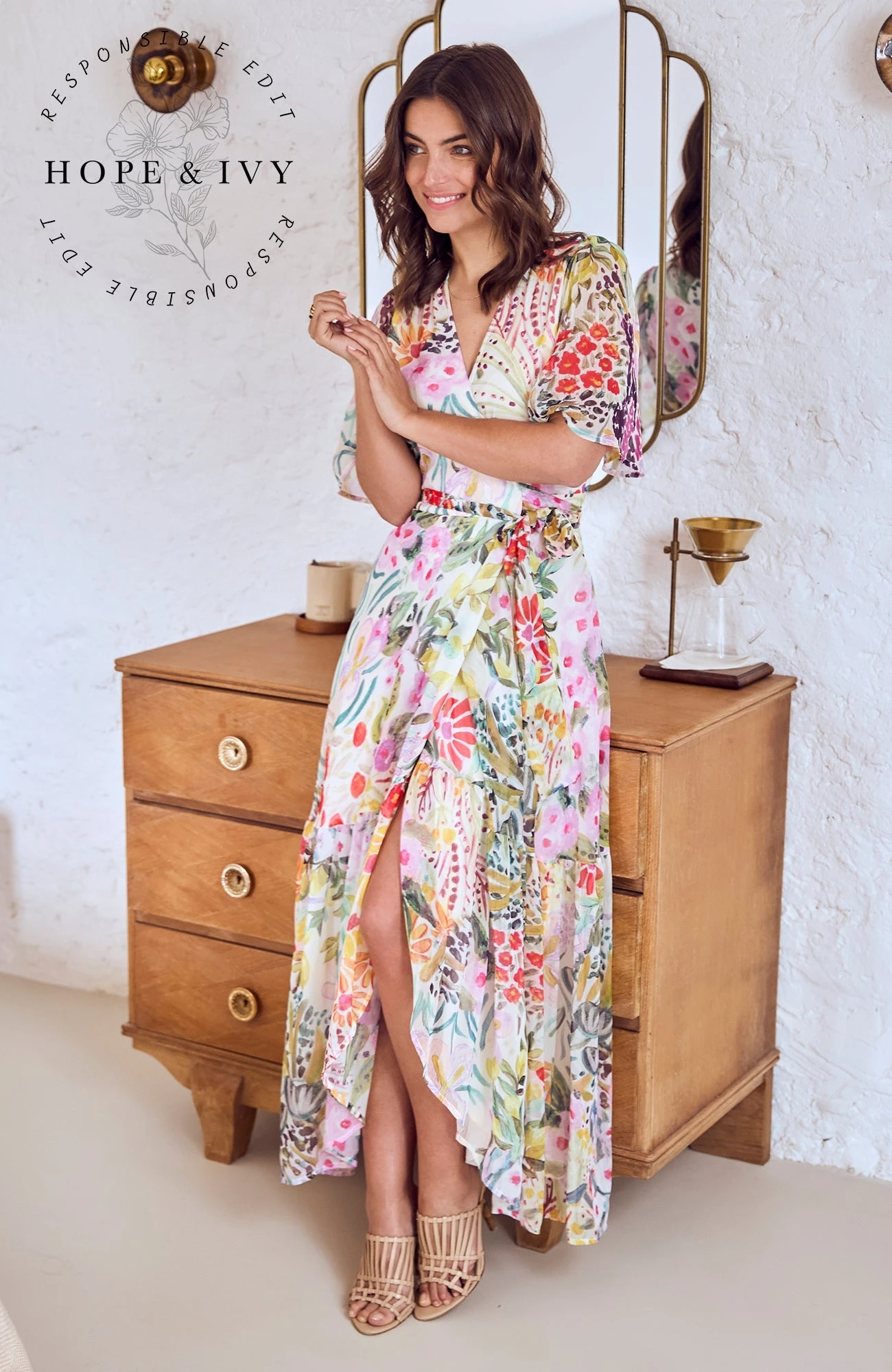 Discover a classic Hope & Ivy silhouette in this coveted classic. Elegant, hand-designed botanicals in shades of pink and yellow decorate an ivory base while the heritage wrap front and bow tie waist promise a beautifully flattering shape. The Julia is completed with full flutter sleeves, making it a perfect choice for wedding guest dressing, garden parties, and all your upcoming summer occasions.