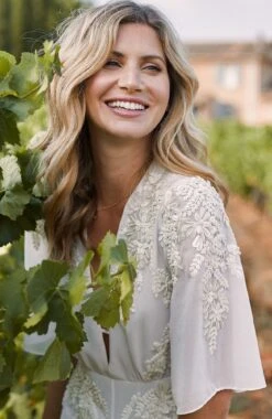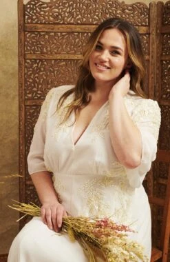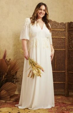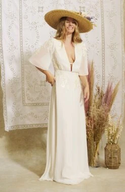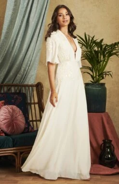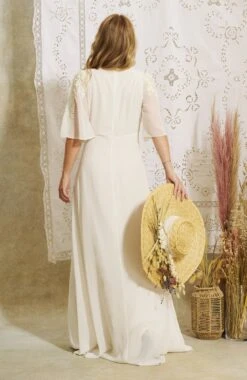 Mesmerise and melt hearts in this celestial Hope & Ivy design. Handcrafted beading decorates the soft cream base with floral embellishments adorning the sleeve, bust and waist. Flutter sleeves and plunge neckline create a beautiful silhouette, further finessed by covered button detailing. The cascading skirt finishes at sweeping floor length. Be every bohemian bride’s envy and glide with gorgeousness in this stunning spring style.