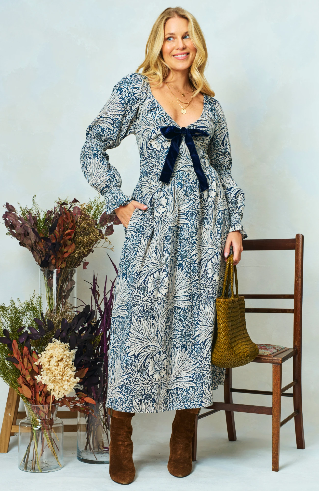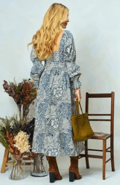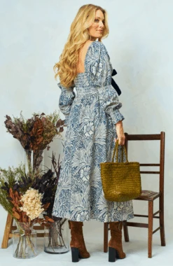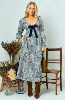 Renowned William Morris print meets fabulous Hope & Ivy design with this V-neck maxi dress made in collaboration with The William Morris Society. Long, elasticated blouson sleeves accompany a full, romantic midi skirt, ensuring a beautifully feminine silhouette. The dress is finished with a stylish velvet bow for extra elevation, whilst the shirred back panel ensures ease of wear.Â