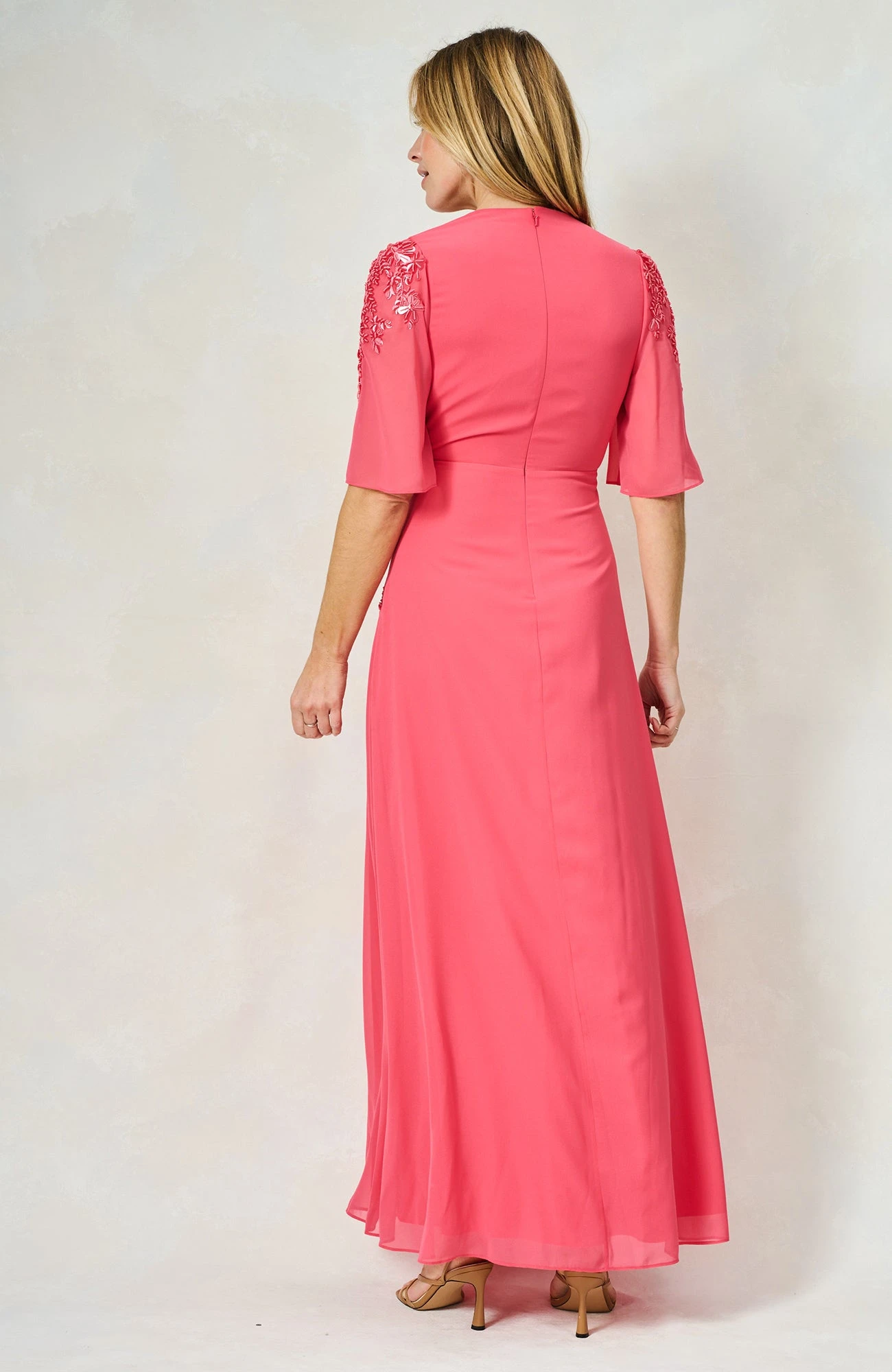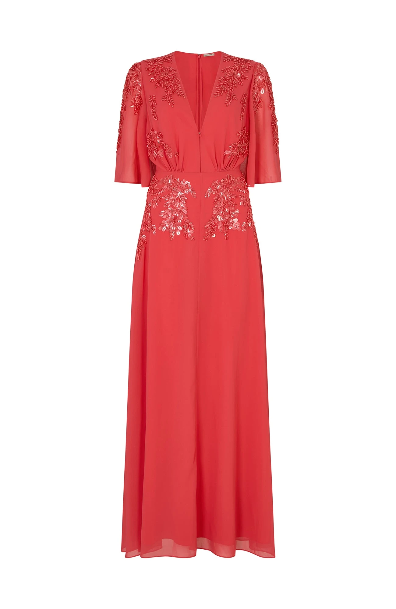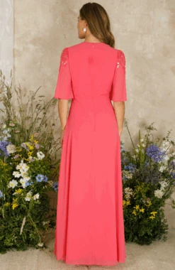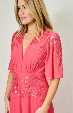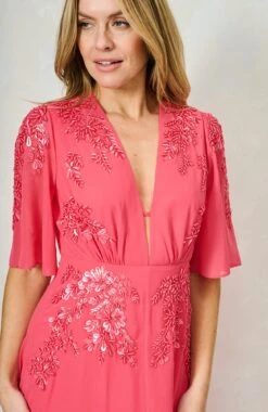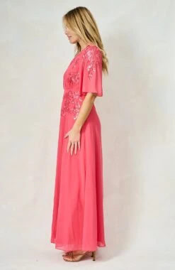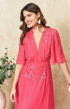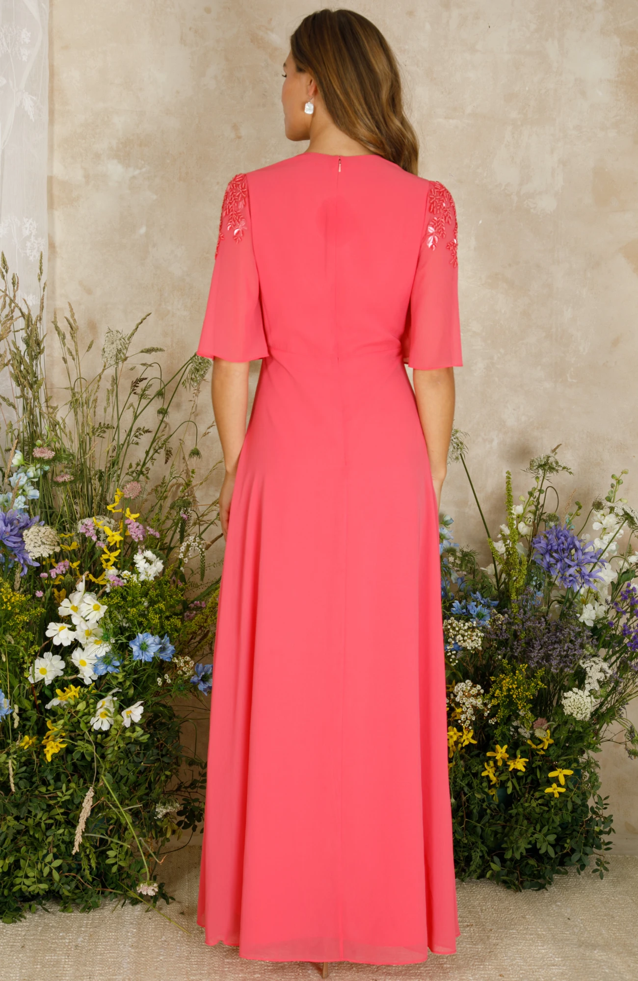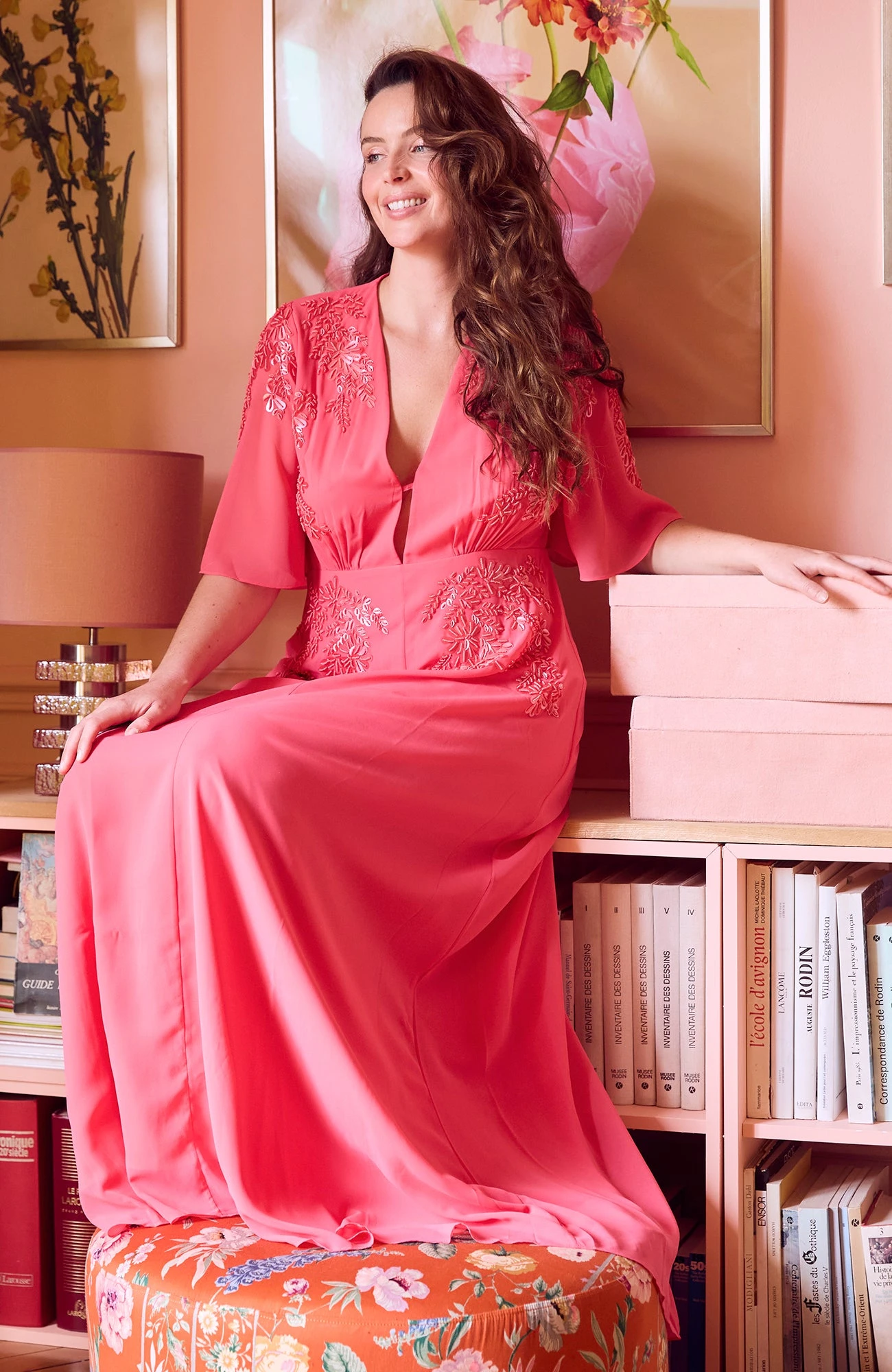 Wow onlookers in The Kemi, a stunning, coral-pink, maxi dress from Hope & Ivy. Handcrafted floral embellishments cover the sleeves, bust and skirt, with flutter sleeves and a plunging neckline creating a beautiful silhouette. The cascading skirt finishes at sweeping floor length, and hidden hook and eye detail on the neckline allows for the plunge to be adjusted as desired. This is the perfect party piece for making an entrance at any event this season.