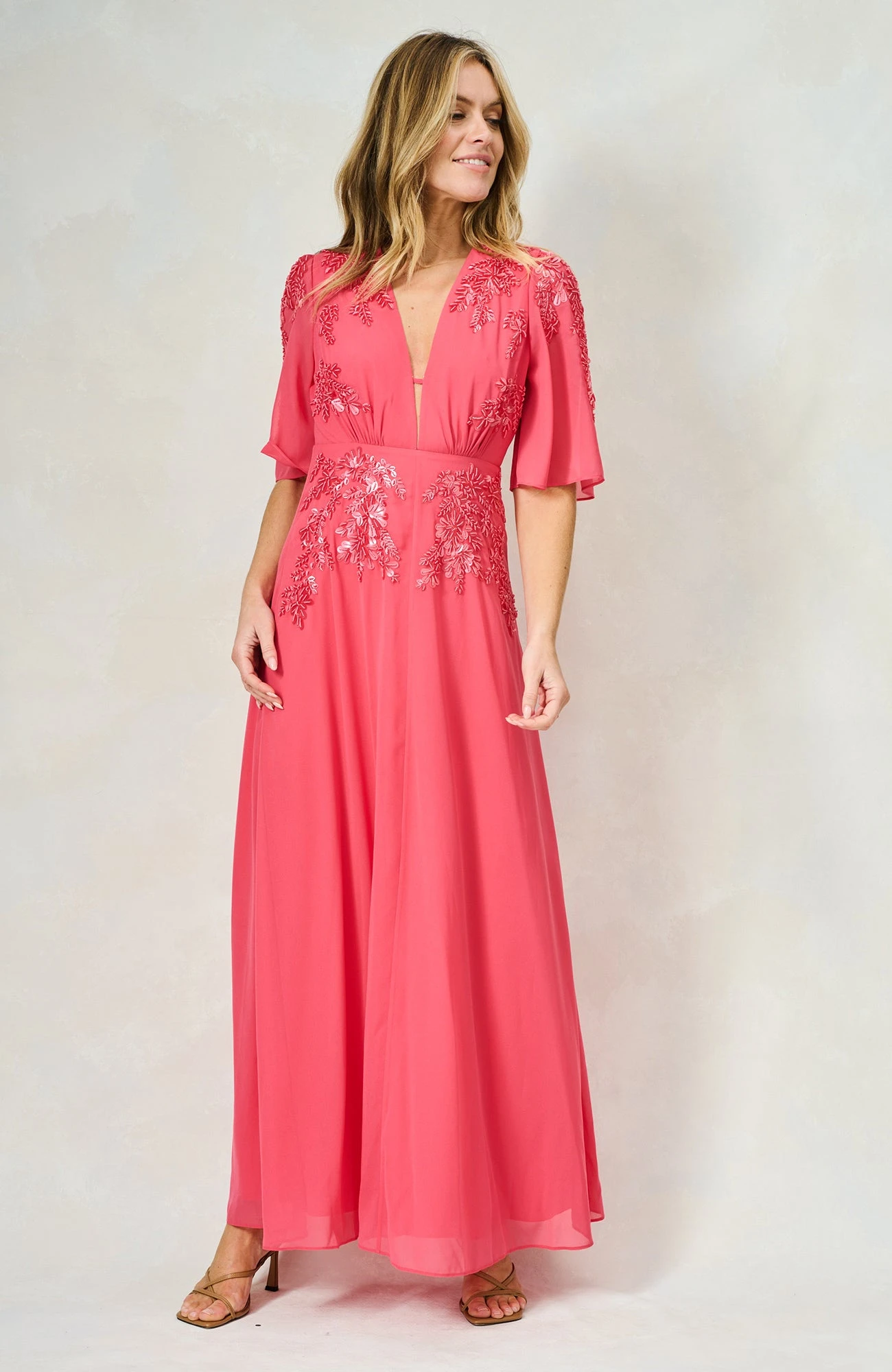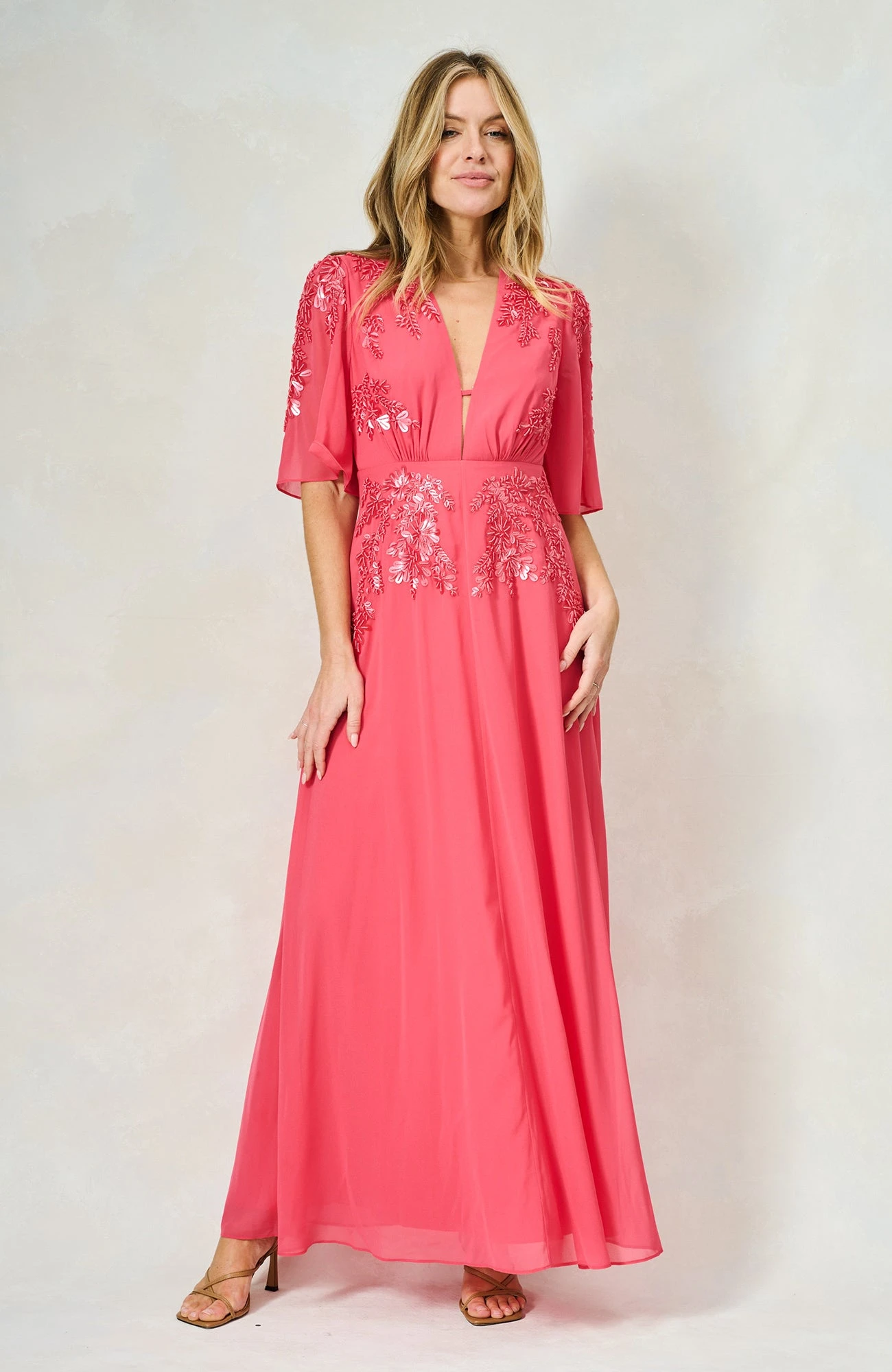 The Kemi Plunge Front Embellished Maxi Dress With Flutter Sleeve