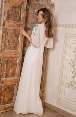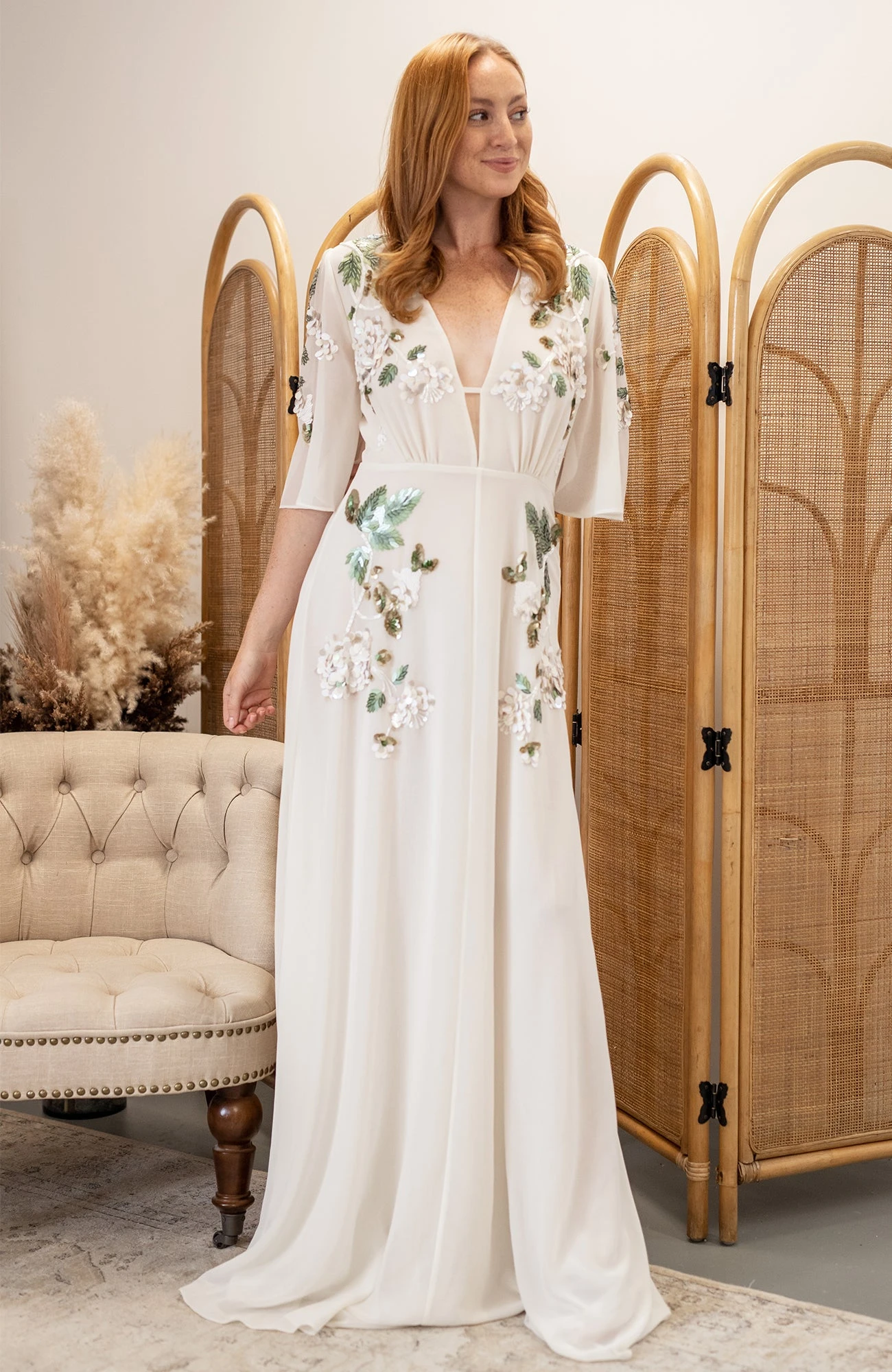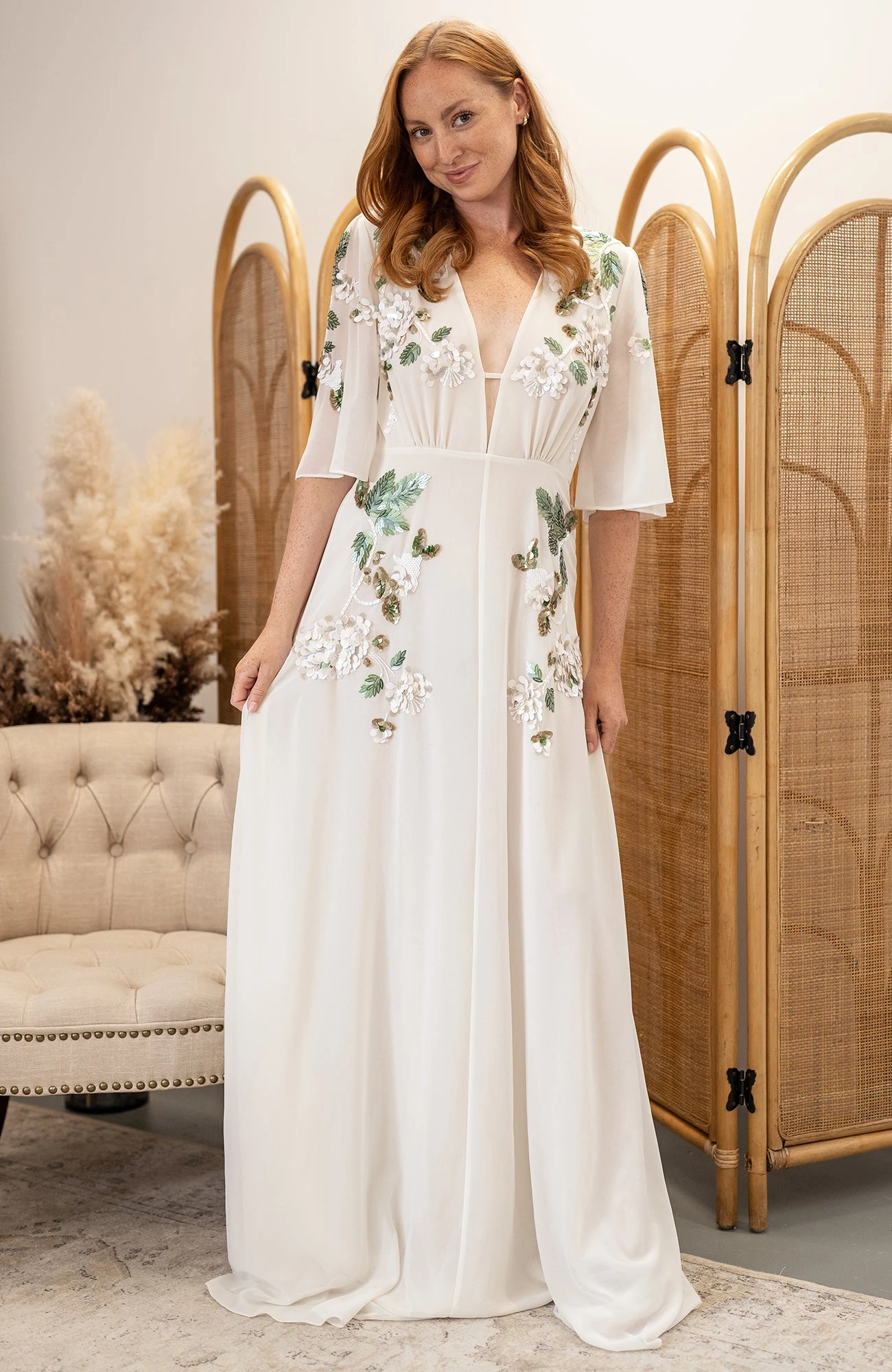 Mesmerise and melt hearts in this Hope & Ivy design from our Bridal collection. Handcrafted beading decorates the soft ivory base with floral embellishments adorning the sleeves, bust and waist. Flutter sleeves and a plunging neckline create a beautiful silhouette, with the cascading skirt finishing at floor length. Be the envy of every bohemian bride and glide with gorgeousness in this stunning spring style.Â