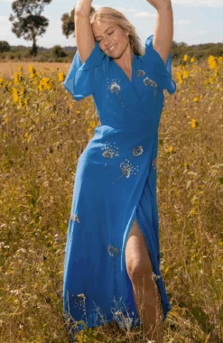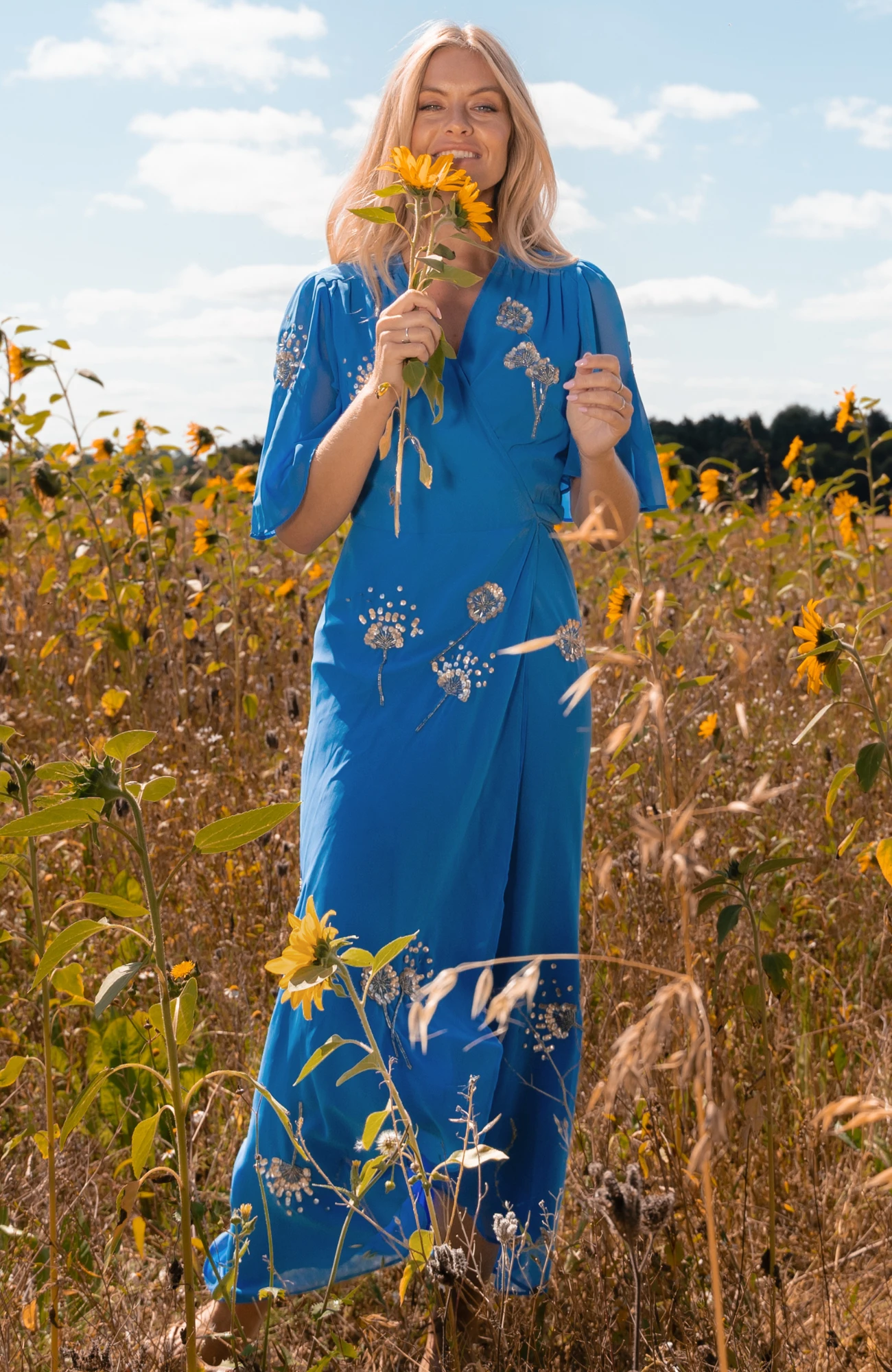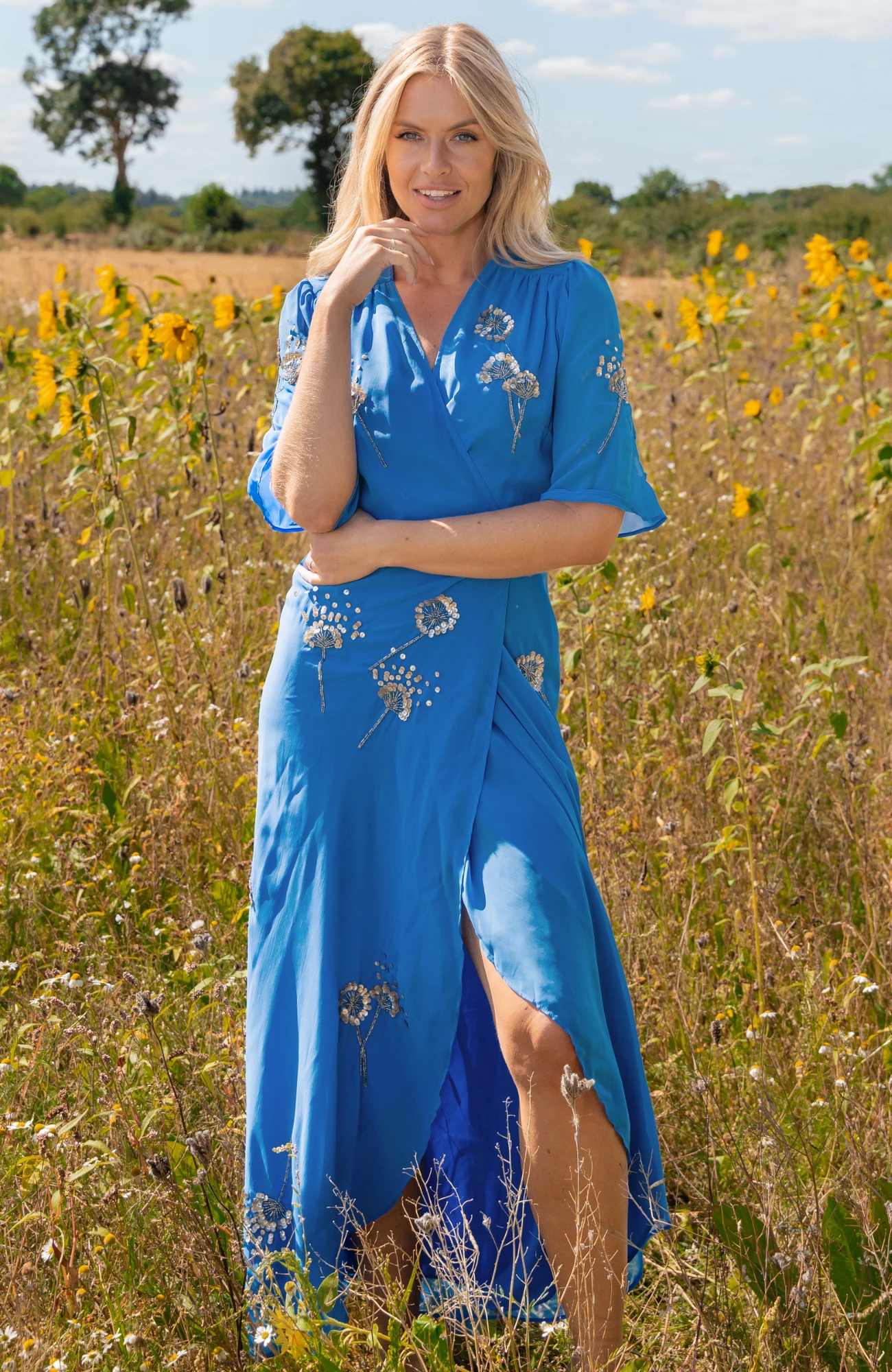 Fall head over heels in love with Hope & Ivy embellishment at its very best in this signature wrap style from our new spring collection. Sparkling silver and golden embellishments are strewn across the blue base, making this a gorgeous stand-out piece. With flutter sleeves, a plunging v-neckline, and tie waist details, this stunning silhouette is bound to turn heads this season.