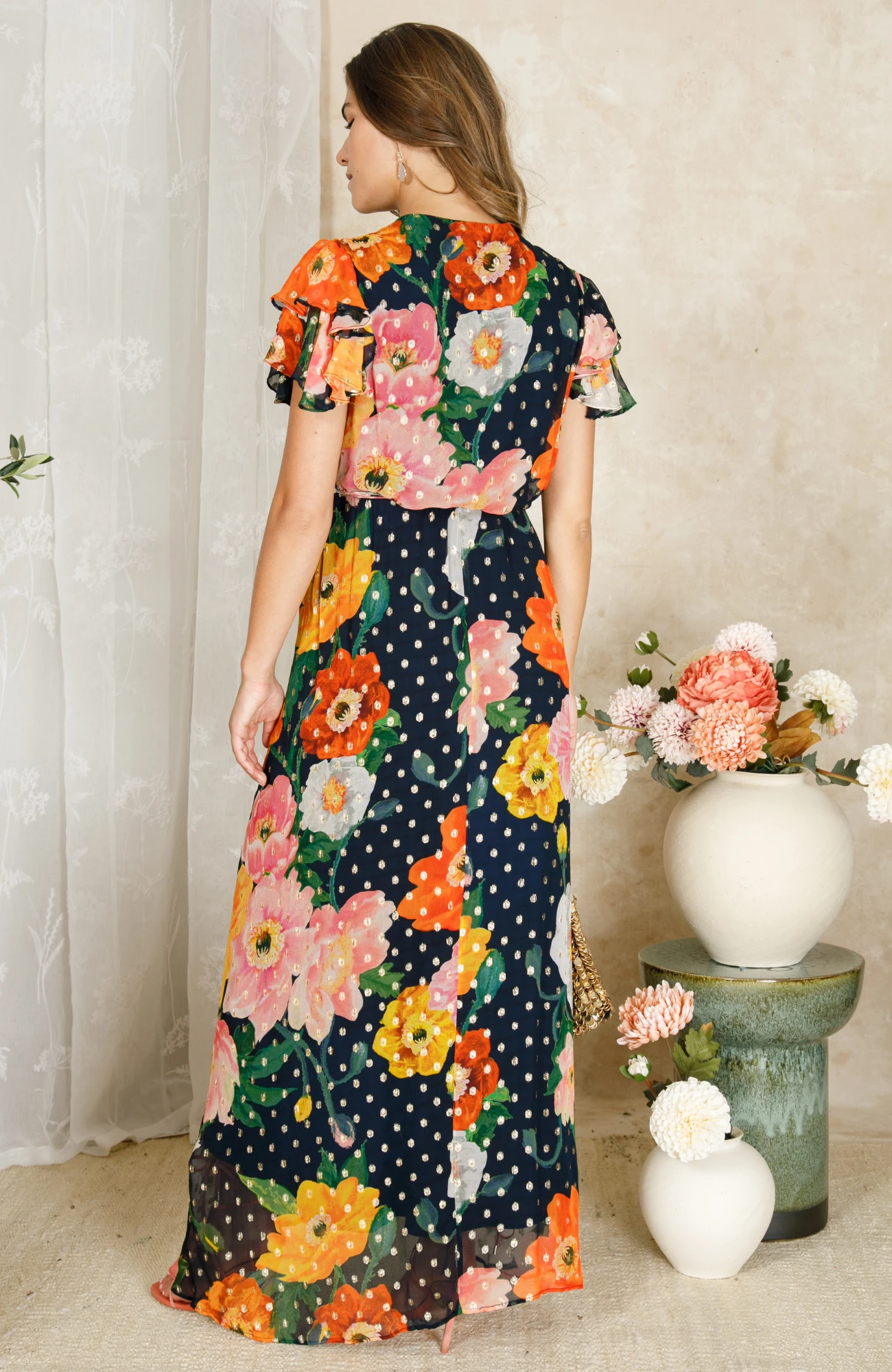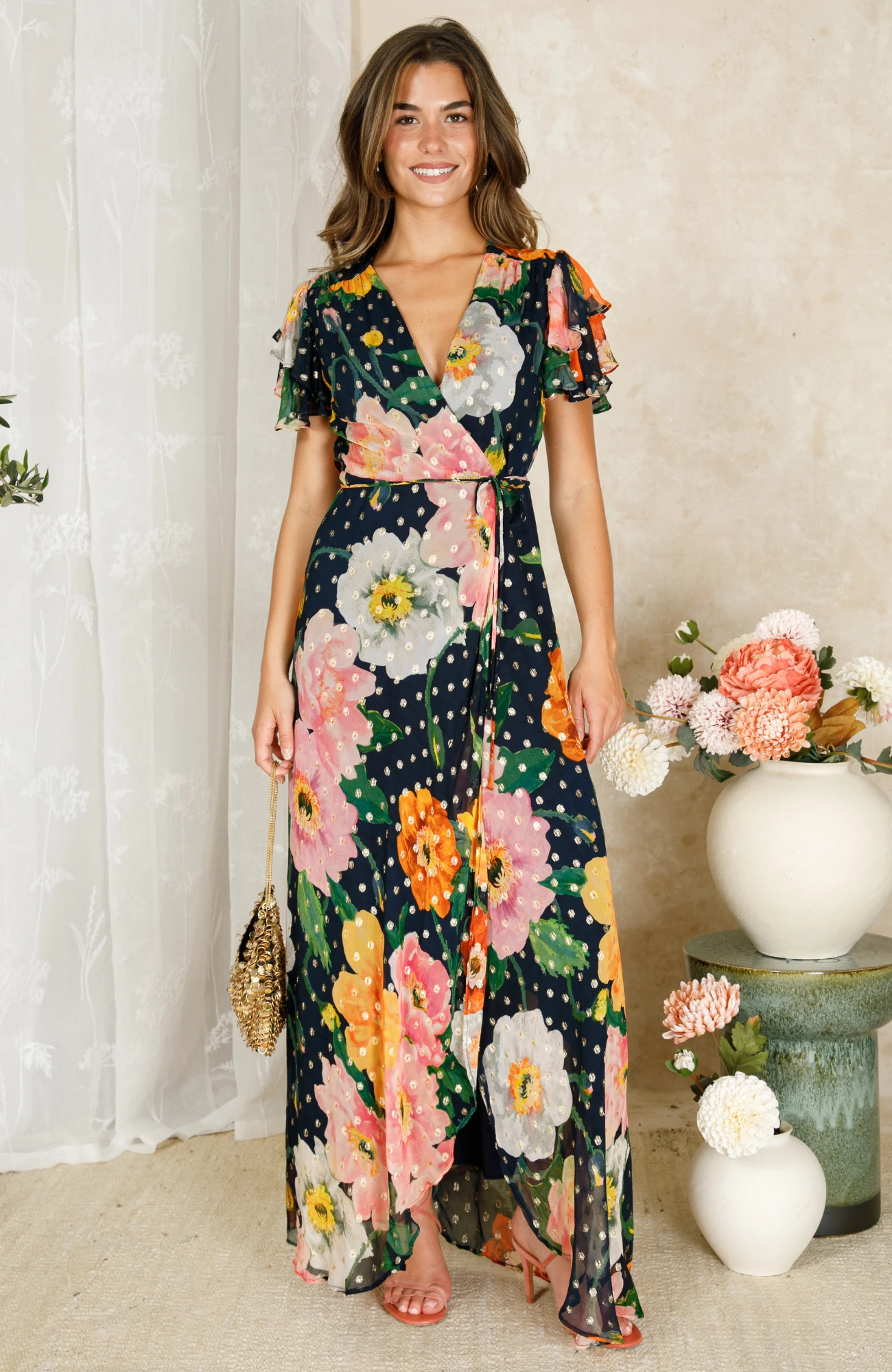 Fall head over heels in love with signature Hope & Ivy blooms in this flattering wrap style from our new summer collection. Woven with sparkling golden Lurex polka dots, this lightweight georgette style is printed with oversized poppies in pink, orange and ivory. With layered flutter sleeves, a plunging v-neckline, and tie waist details, this stunning silhouette is bound to turn heads this season.