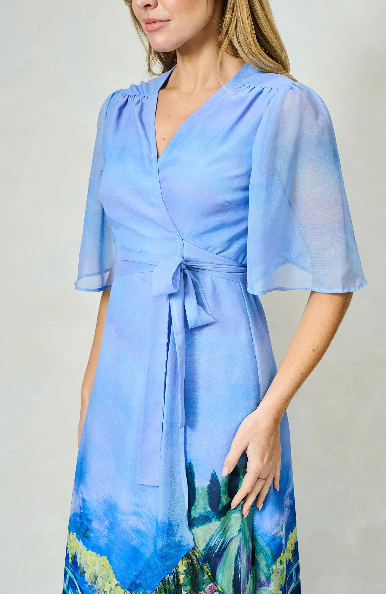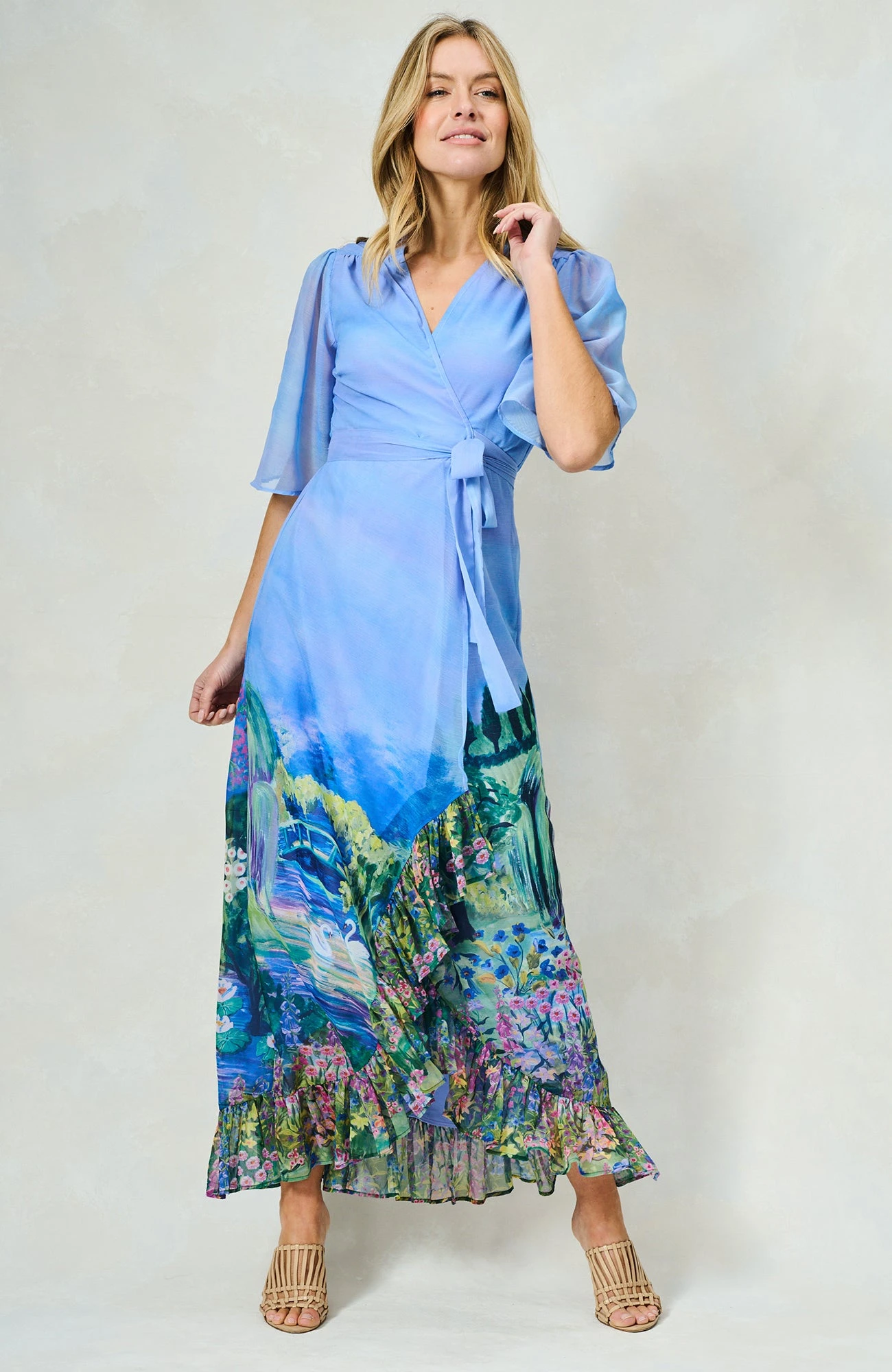 The Nadia Flutter Sleeve Maxi Wrap Dress with Tie Waist and Contrast Hem