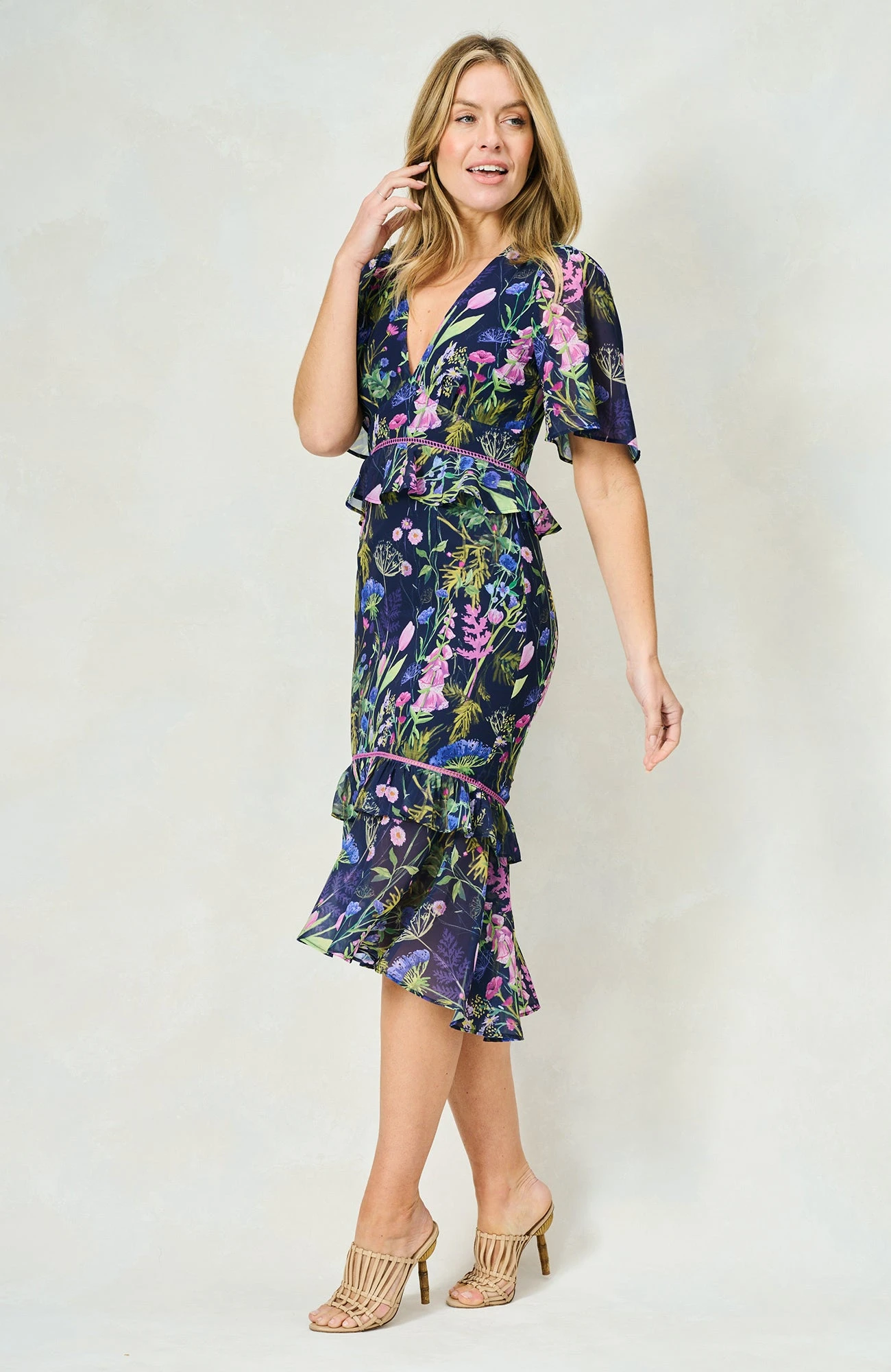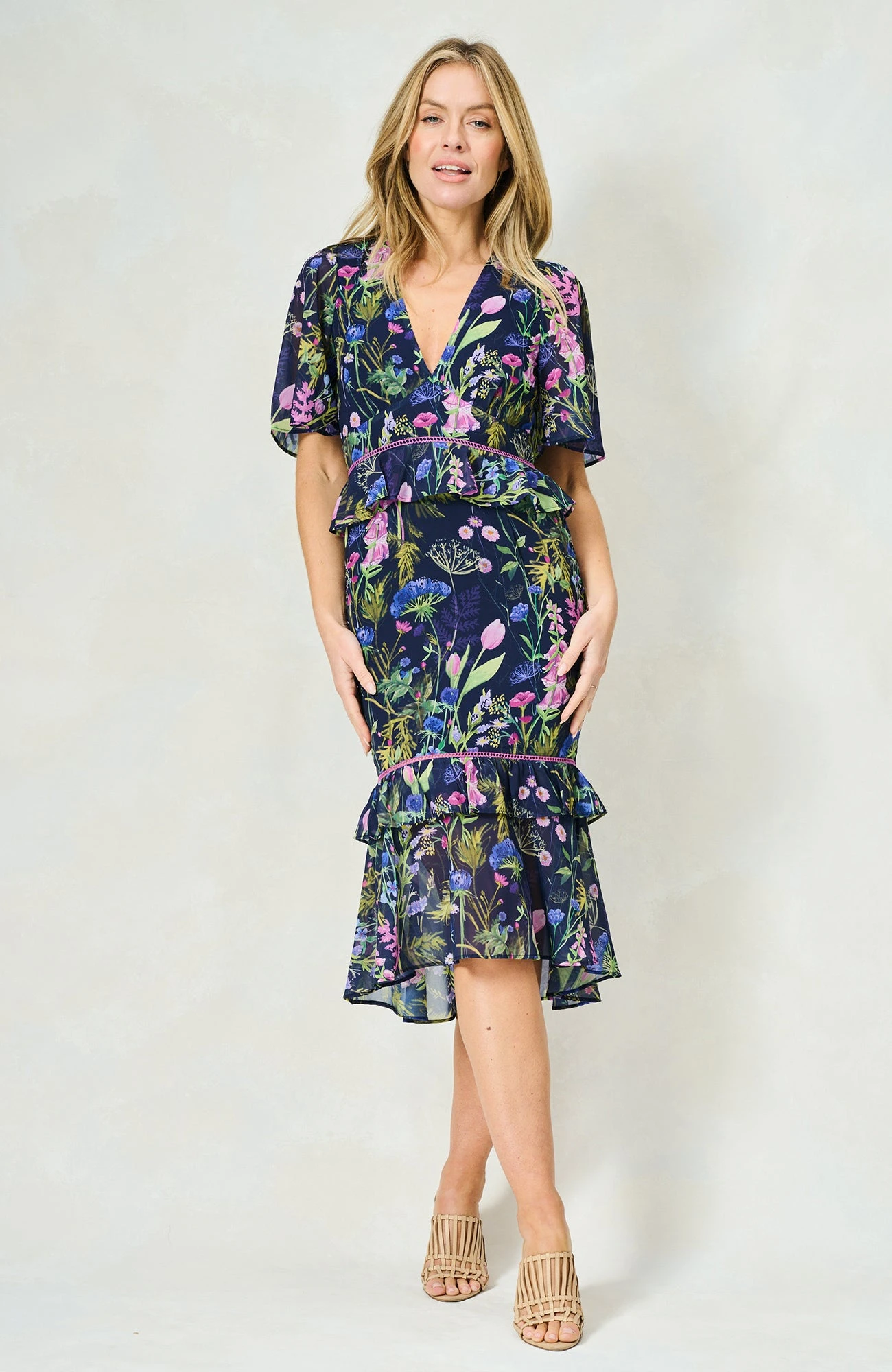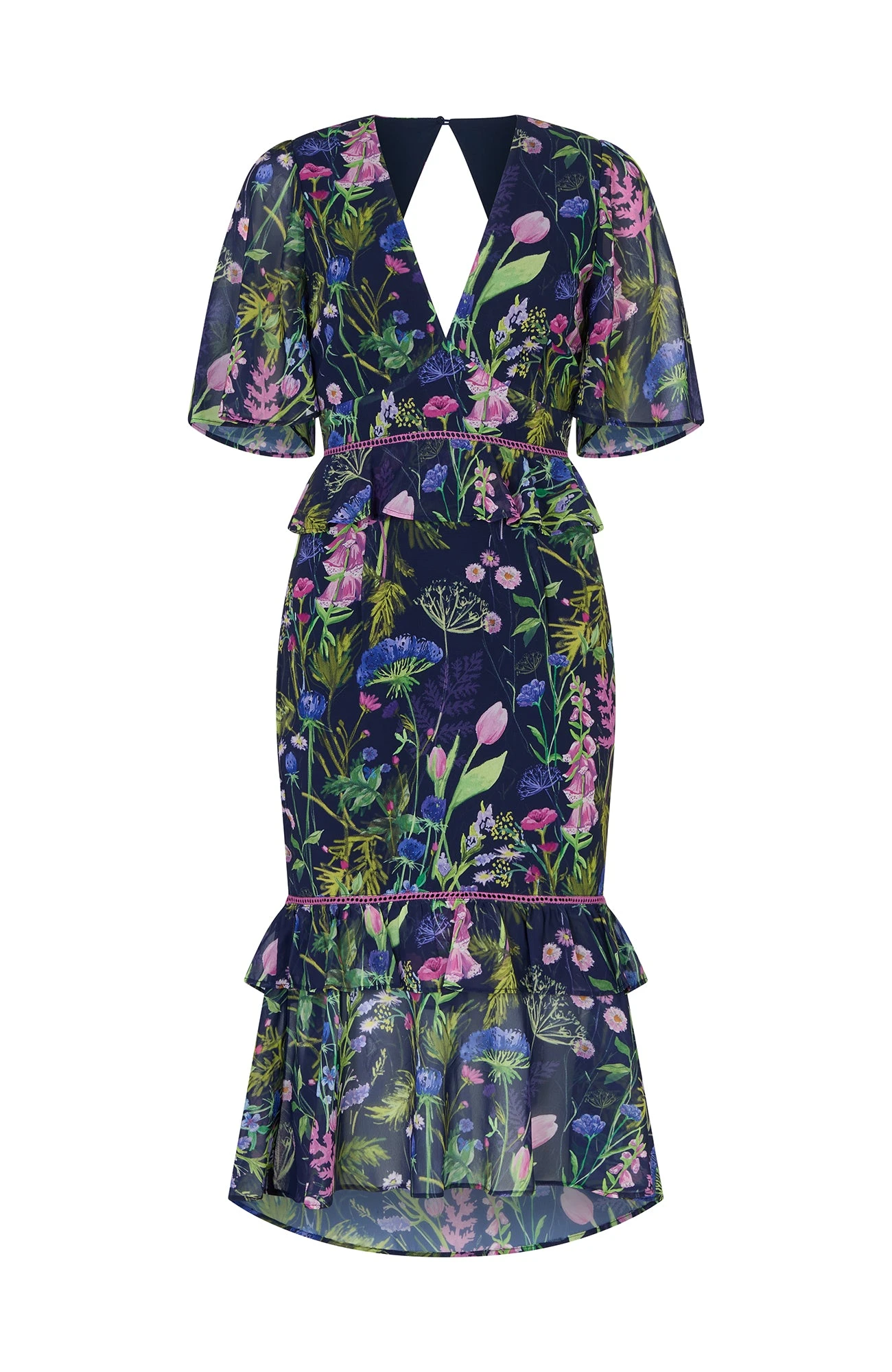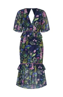 The Naomi V-Neck Midi Tea Dress with Peplum Waist, Tiered Ruffle Skirt and Ladder Trim