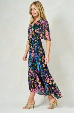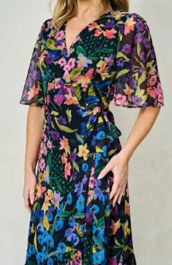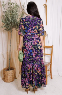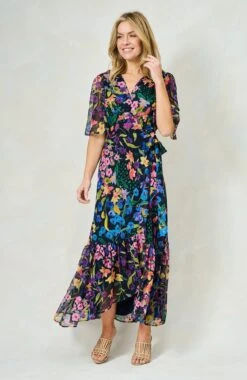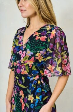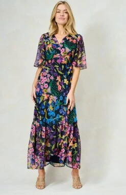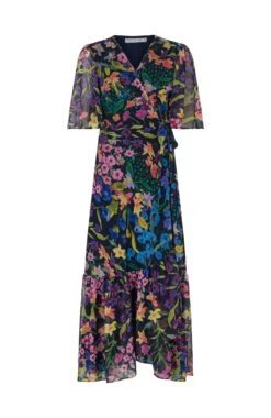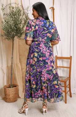 Experience signature Hope & Ivy print handwriting and a classic silhouette in this design. Cut to a sweeping maxi length from soft chiffon, The Nesta wrap dress exudes a romantic, floaty feel that’s perfect for special occasions. The navy base is decorated with a hand-painted floral print for a colourful mood. The feminine flutter sleeves and adjustable tie-fastening wrap front ensure a streamlined silhouette that’s sure to turn heads.