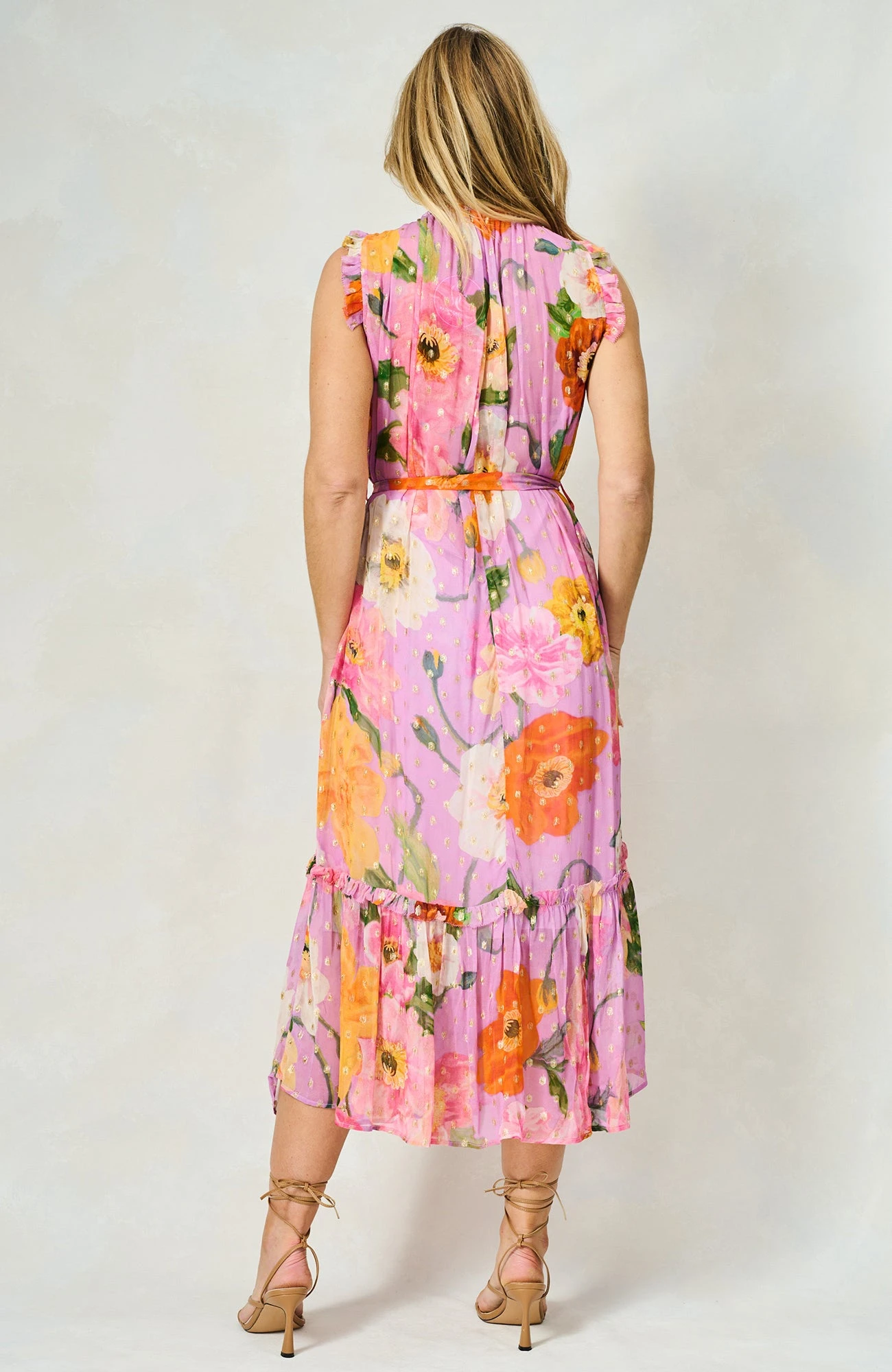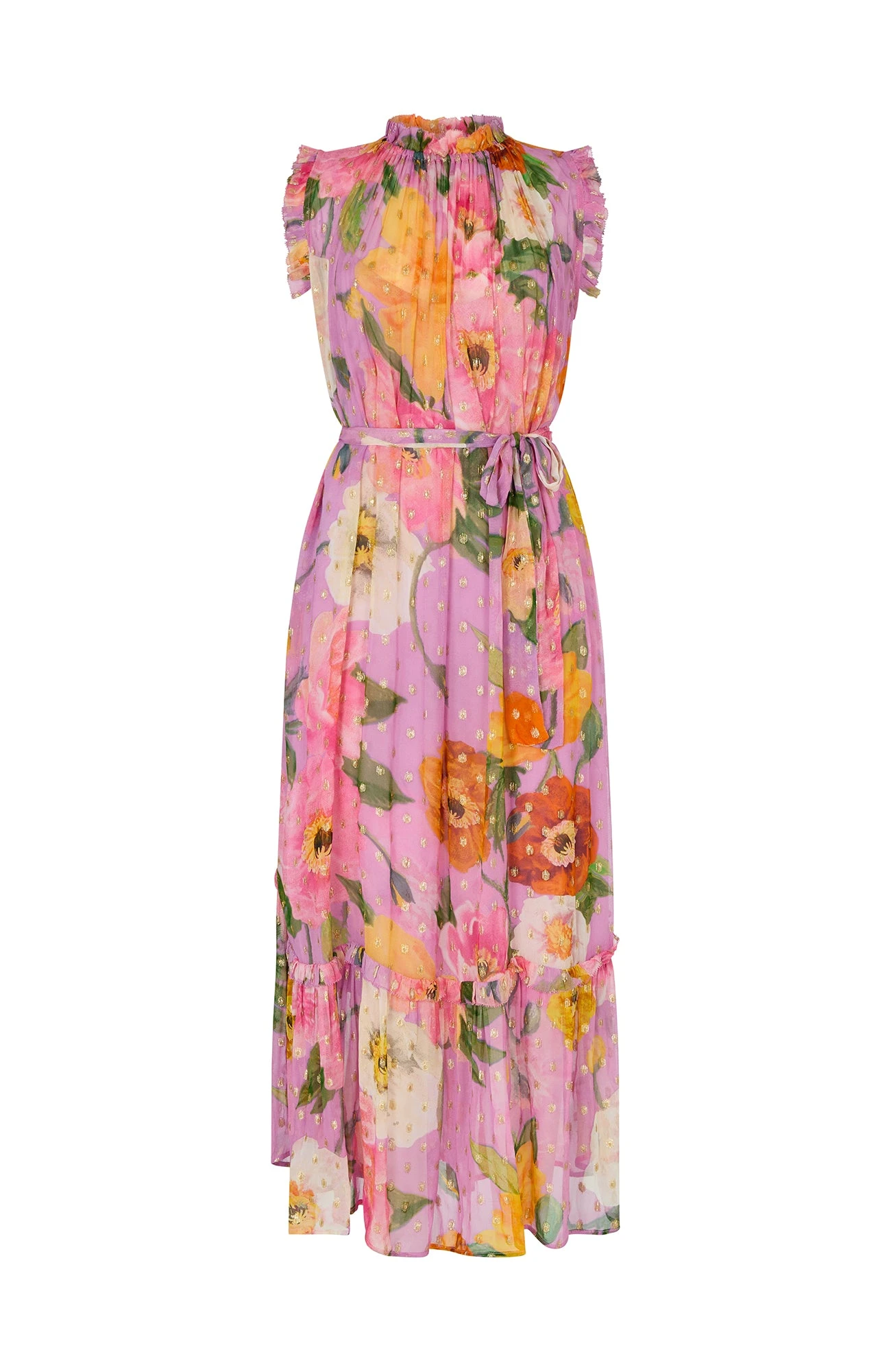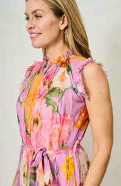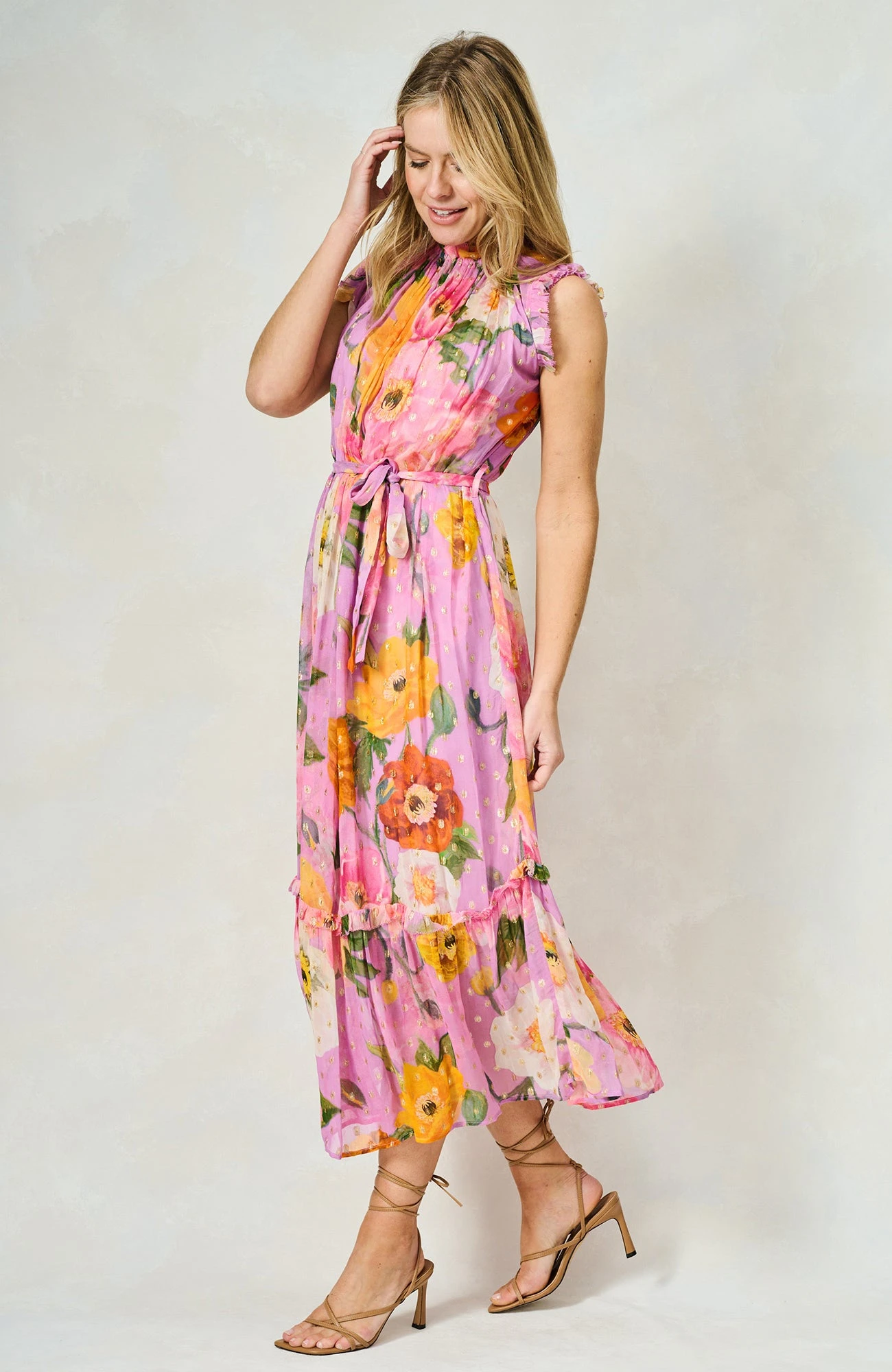 In pretty pastels, The Signe is cut to a high-neck silhouette from floaty georgette that can be cinched with the waist tie. Woven with sparkling golden Lurex polka dots, this breezy lightweight style is printed with oversized poppies in pink, orange and ivory. We love how the ruffled trims and banded hem add to the feminine feel.
