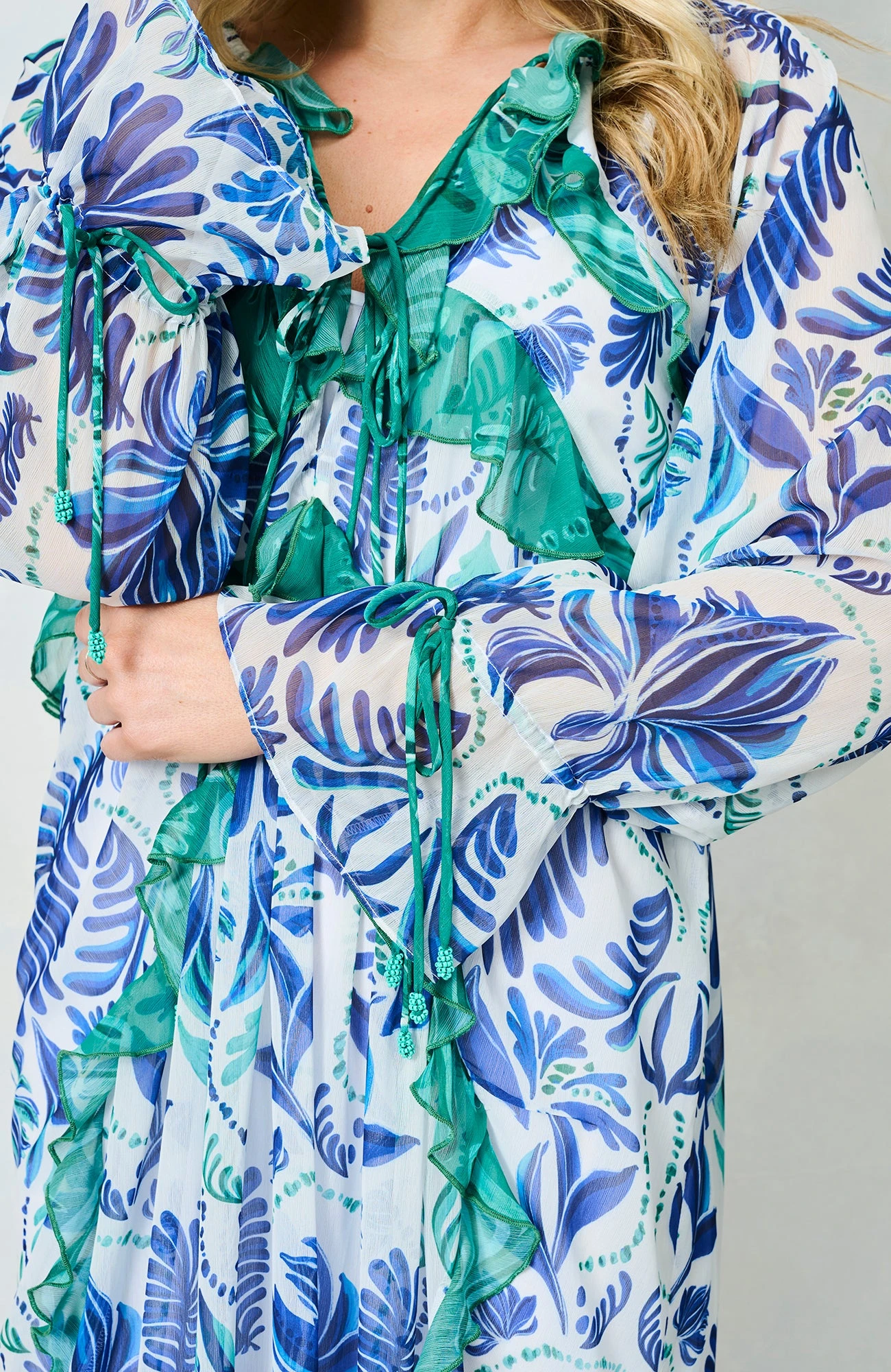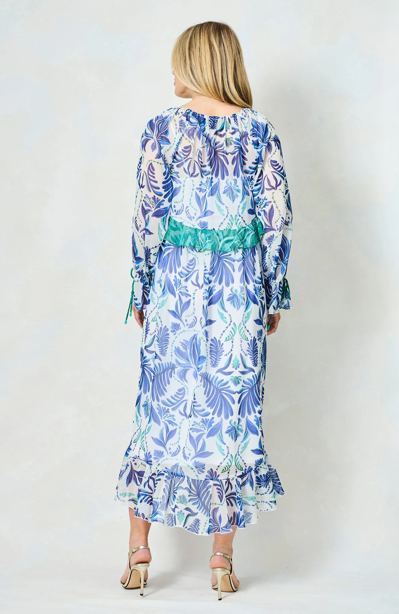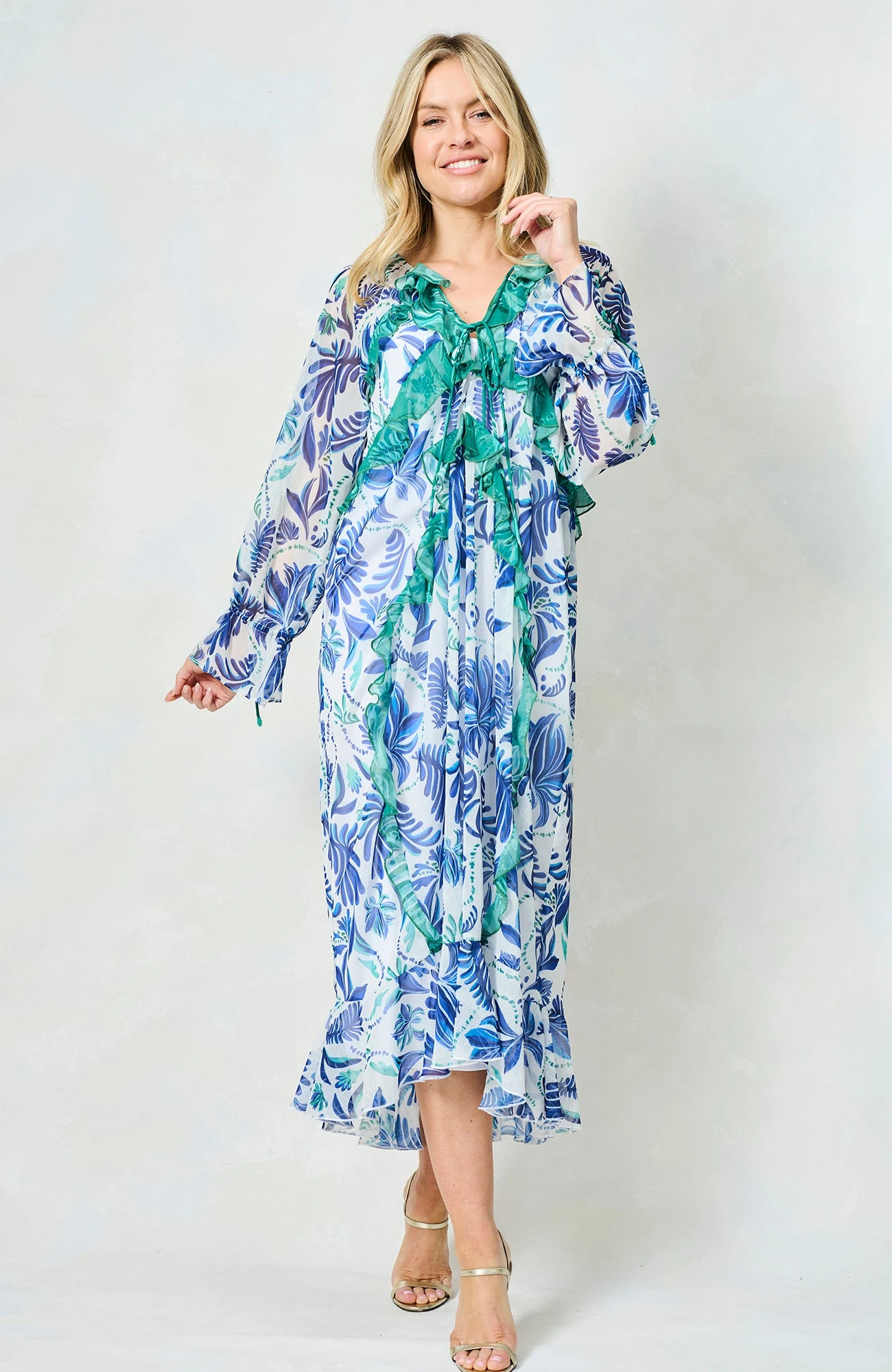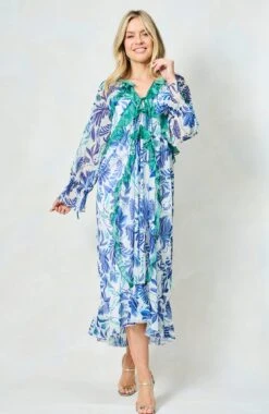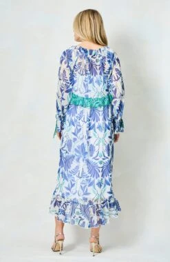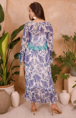 Summer is the season for fresh, floaty styles, and they don’t come much more gorgeous than The Siri. Featuring a hand-painted print in beautifully bright shades of blue, this dress is completed by elevated green ruffles, full-length blouson sleeves, beaded tassels, and a chic, adjustable tie front – a dreamy dress whether you’re poolside or off to an evening event!