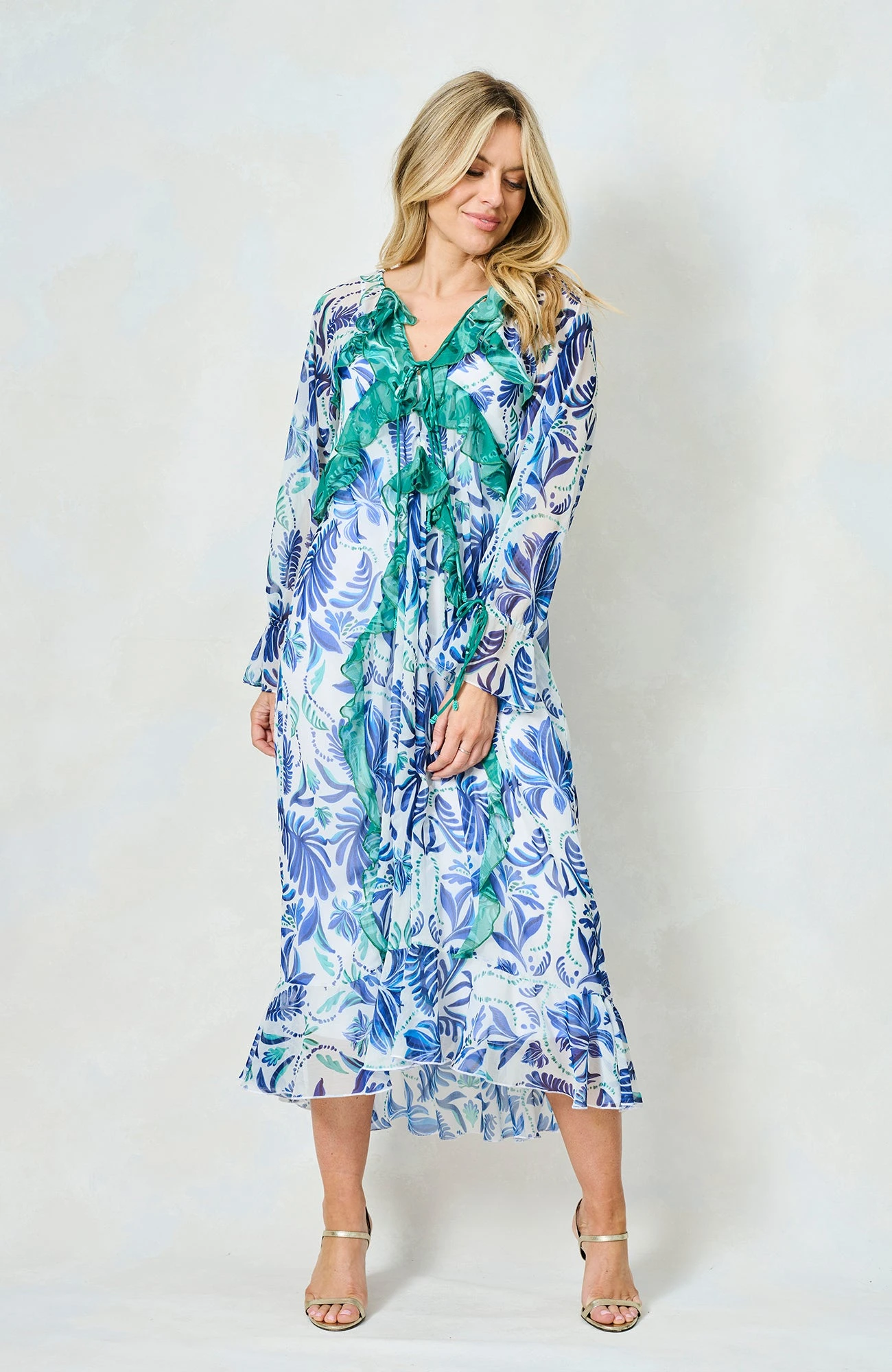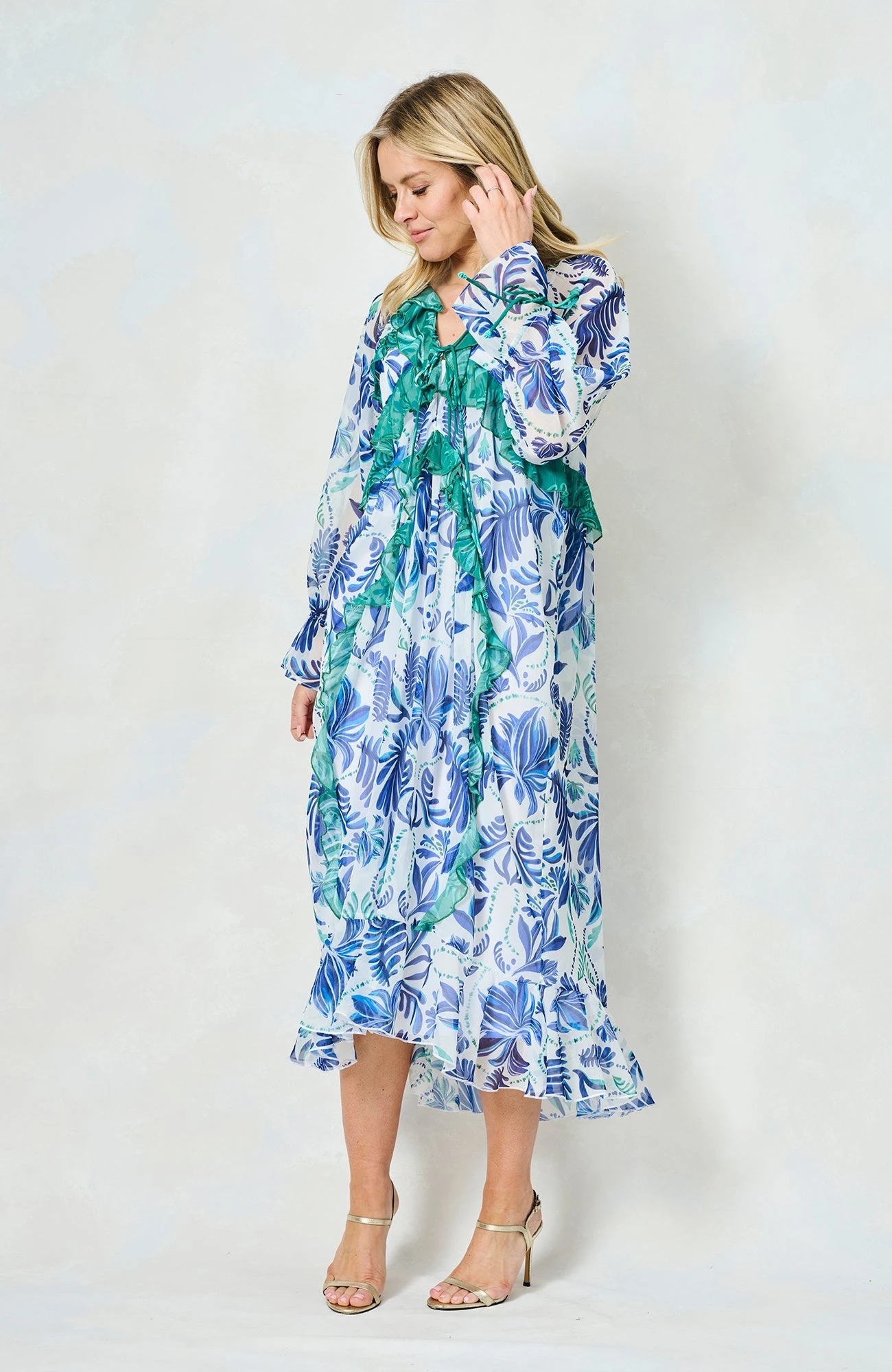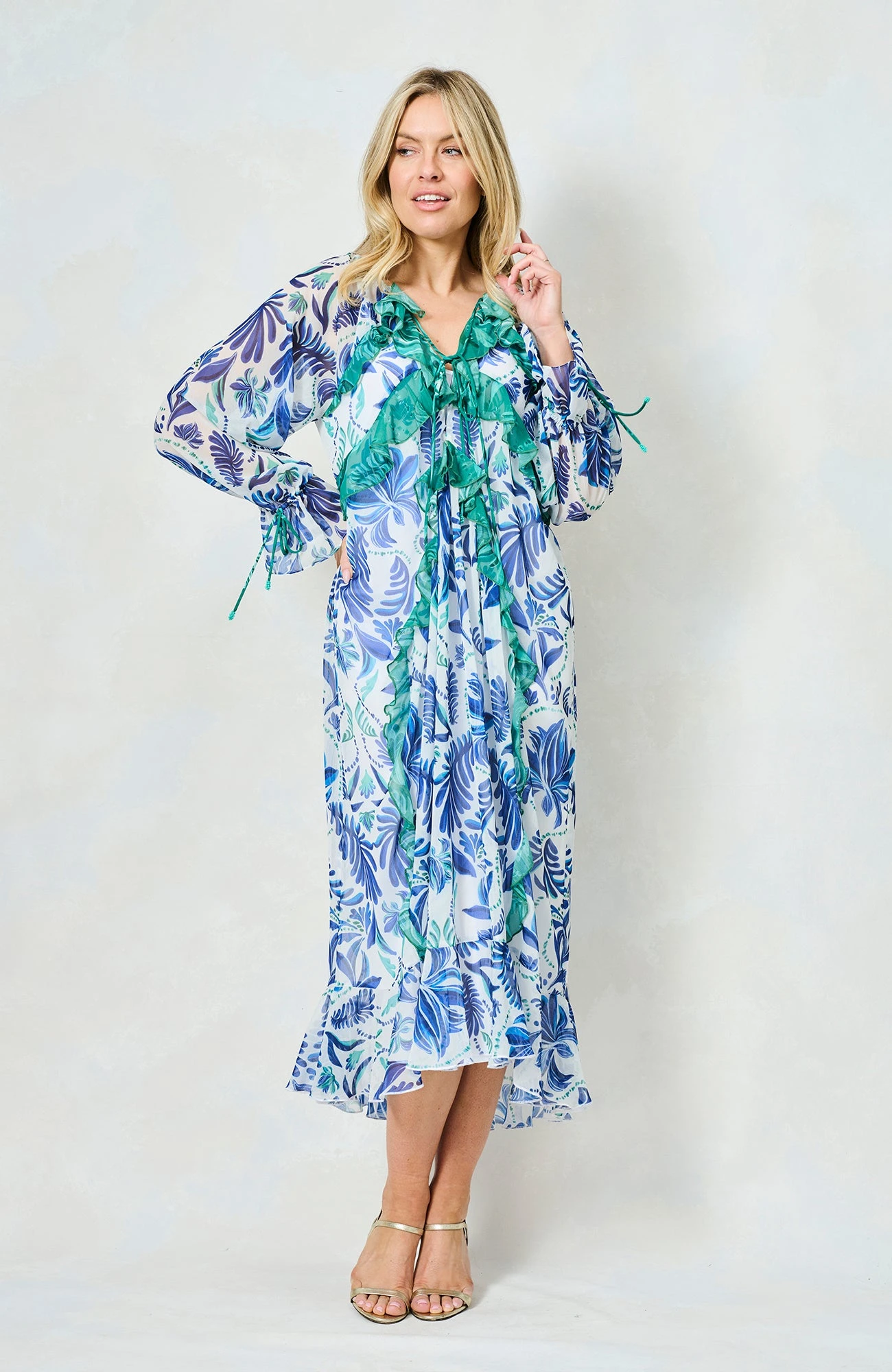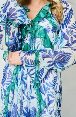 The Siri Tie Sleeve Maxi Dress with Contrast Print and Frill Details