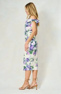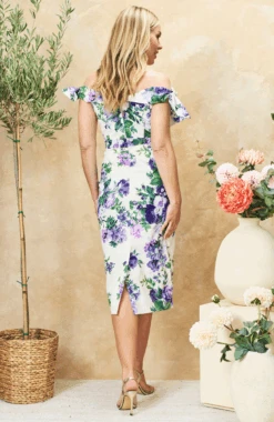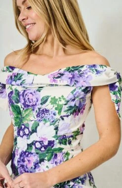 Create an elegant impression in The Suzette, an off-the-shoulder style from Hope & Ivy’s latest collection. It’s cut from ivory sateen that’s printed with vintage-inspired purple and green florals, then finished with draped bows at the arms. It’s darted to a form-fitting shape and features a vent at the back of the pencil skirt to allow for ease of movement.