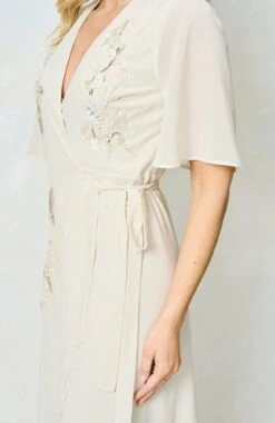 Discover a classic Hope & Ivy silhouette in this charming bridal wrap dress. With delicate, floral embellishments across the shoulders, bust and waist of this elegant wedding-ready style, this wrap front dress is a sure winner. A bow tie waist promises a beautifully flattering shape, while the full flutter, semi-sheer sleeves make it a perfect choice for your special day.