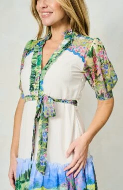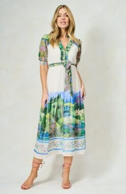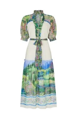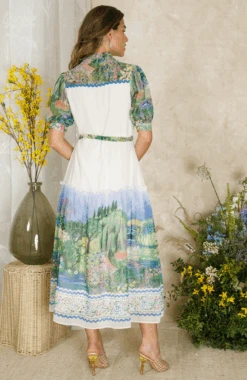 Ready to have heads turning, this timeless design features an exquisite, hand-stylised landscape scene across the skirt, sleeves, and shoulders. Inspired by Claude Monet’s exquisite gardens in Giverny, this beauty is complete with delicate, semi-sheer blouson sleeves, a flowing, A-line midi length skirt, a tie waist, and functional buttons.